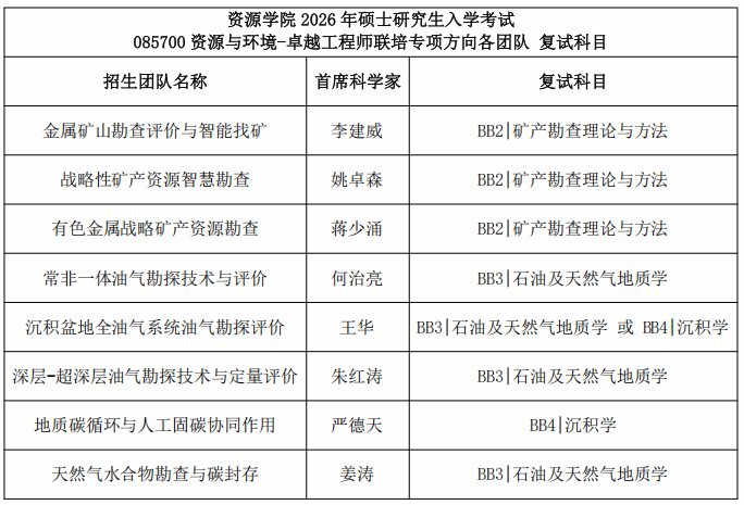 十大买球官方网站2026年硕士研究生入学考试085700资源与环境专业卓越工程师联培专项方向各团队复试科目