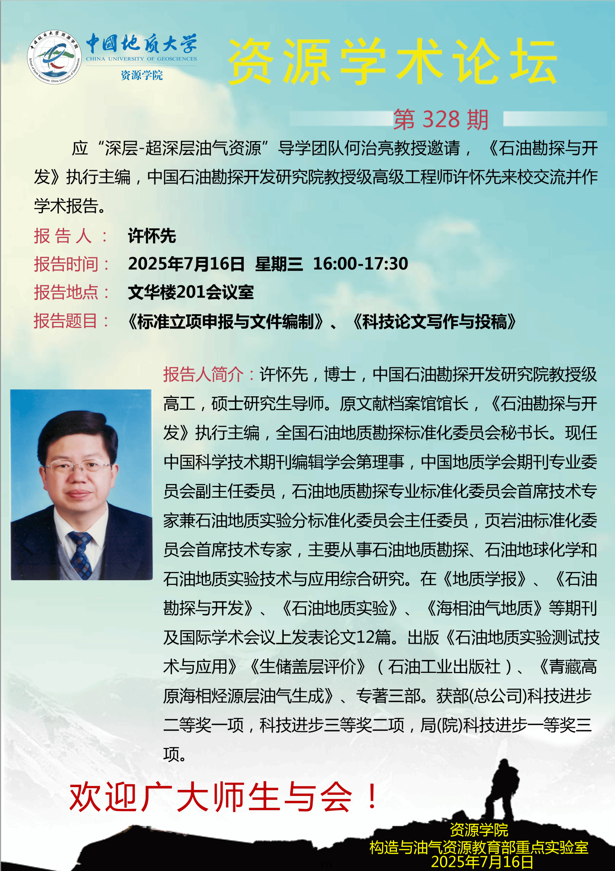 【7月16日】第328期资源学术论坛:许怀先学术报告