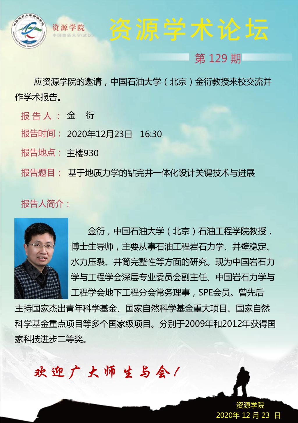 【12月23日】第129期资源学术论坛:金衍学术报告