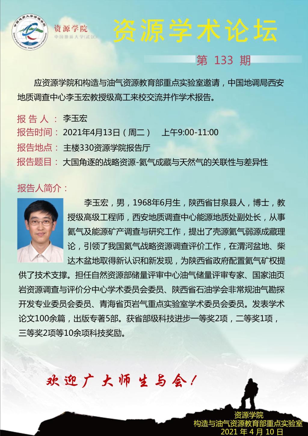 【04月13日】第133期资源学术论坛:李玉宏学术报告