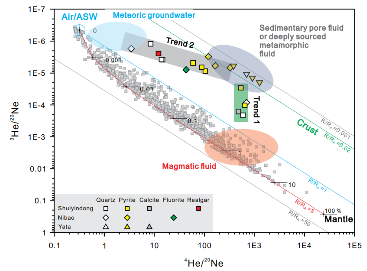 Jin, X.Y., Hofstra, H.A., Hunt, G.A., Liu, J.Z., Yang, W., and Li, J.W*., 2020. Noble gases fingerprint the source and evolution of ore-forming fluids of Carlin-type gold deposits in the Golden Triangle, South China: Economic Geology, v. 115, p. 455-469. https://doi.org/10.5382/econgeo.4703