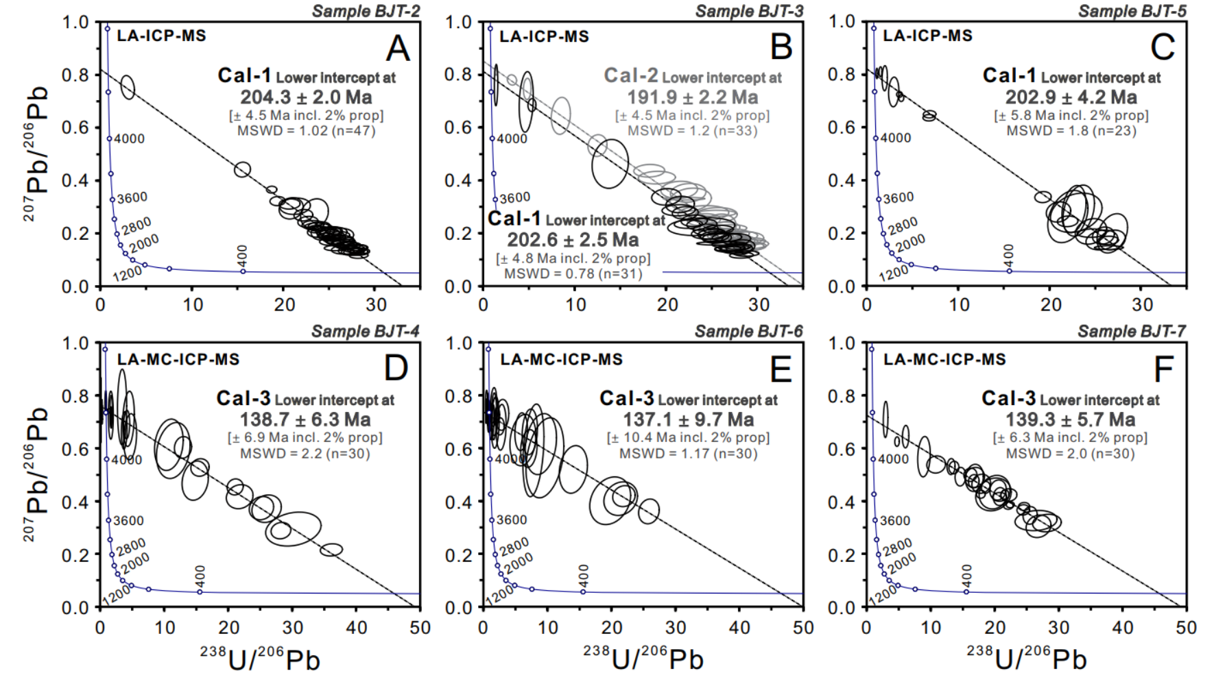 图4. 右江盆地水银洞金矿床六件样品中不同世代方解石U-Pb测年结果