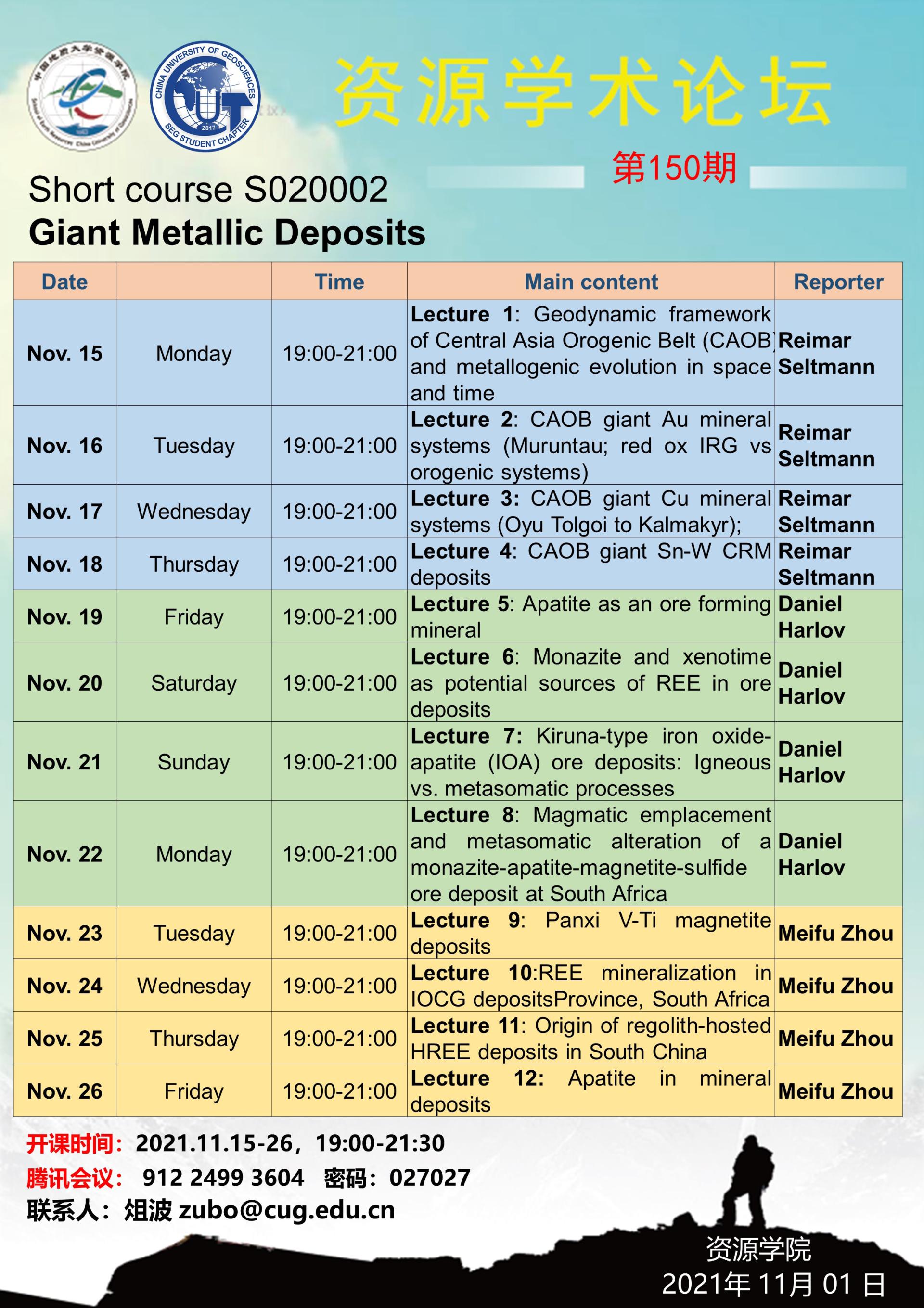 【11月15-26日】第150期资源学术论坛:Giant Metallic Deposits(超大型矿床)