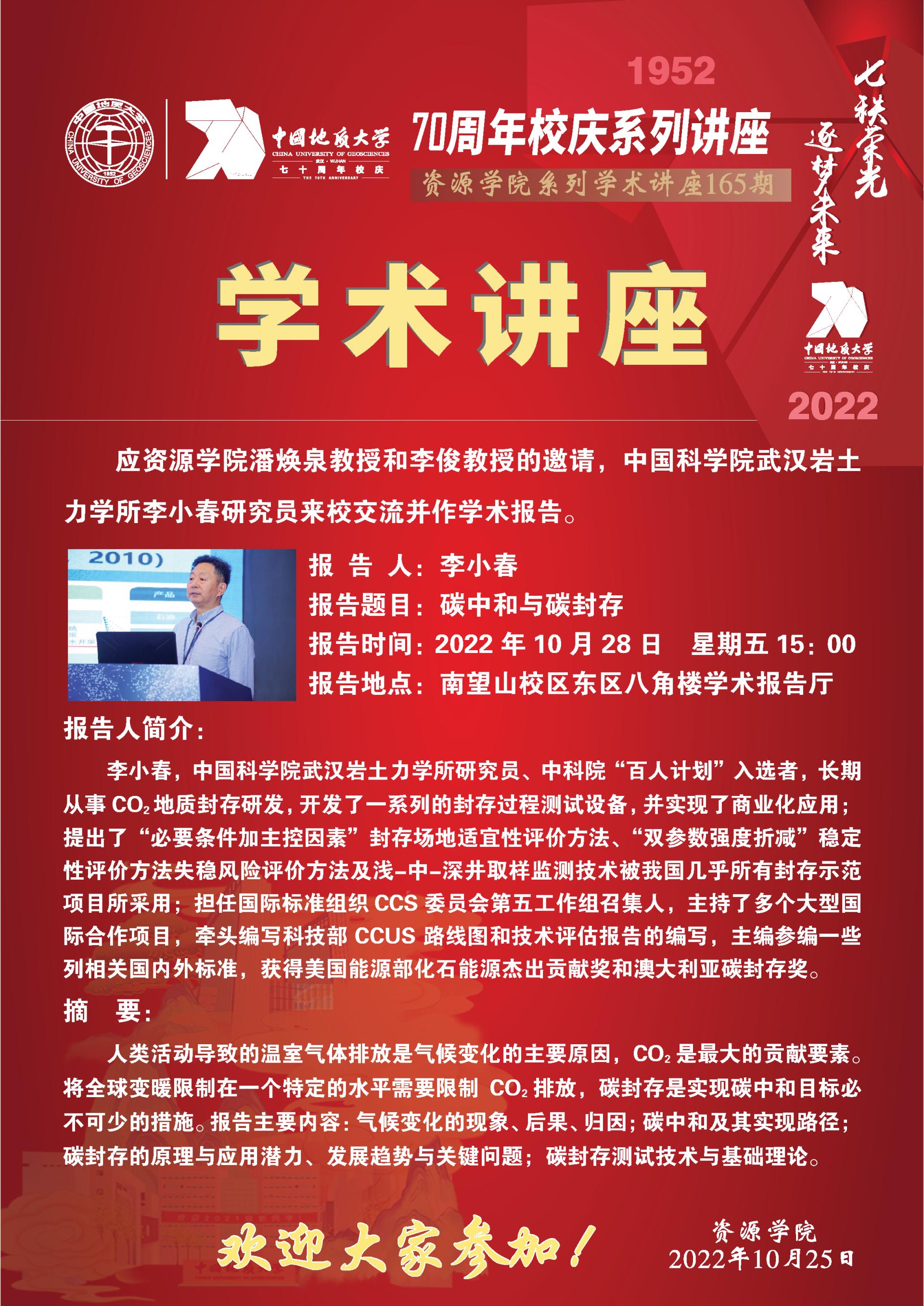 【10月28日】第165期资源学术论坛:李小春学术报告