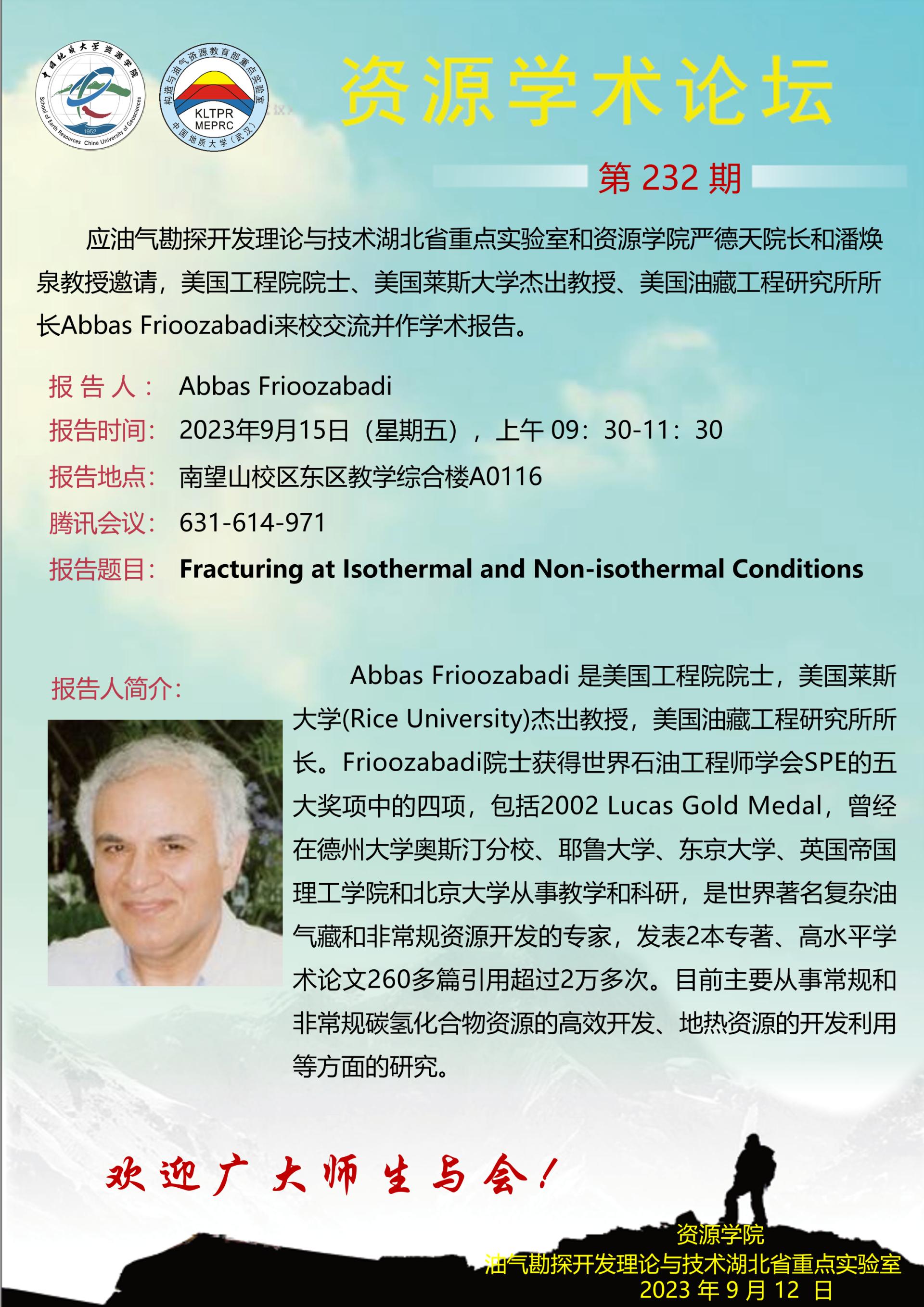 【9月15日】第232期资源学术论坛:Abbas Frioozabadi学术报告