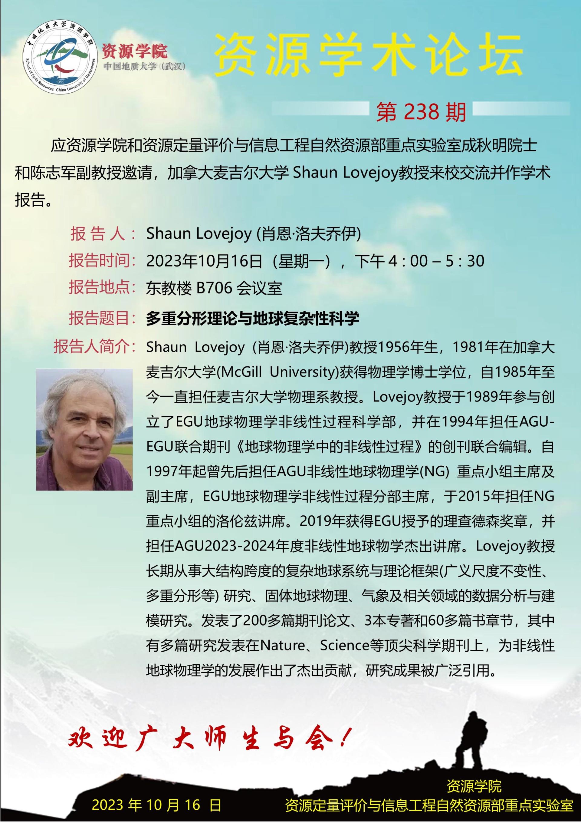 【10月16日】第238期资源学术论坛:Shaun Lovejoy学术报告