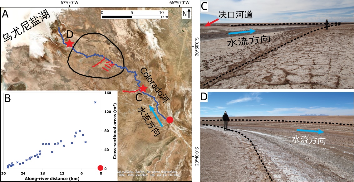 近日,国际知名期刊Journal of Hydrology在线刊发了李嘉光副教授团队陆相湖盆边缘河流末端沉积体系研究的最新成果"Digital elevation models for topographic characterisation and flood flow modelling along low-gradient, terminal dryland rivers: A comparison of spaceborne datasets for the Río Colorado, Bolivia"。文章选取世界上最大的南美乌尤尼盐湖边缘Colorado河末端区为研究对象(图1),成功地构建了研究区的水文模型,模拟了洪水过程,表明漫溢过程中的洪水空间分布特征。该项研究首次精确表征极低缓河流末端地形特征,模拟河道沿程变化下洪水漫溢过程,为广泛运用于旱区河流体系水文过程-沉积响应的研究提供支撑。