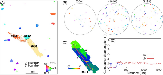 图3花岗岩中电气石(TurG)的EBSD测量结果(A)晶体取向分布图,颗粒颜色对应右下角X方向反极图;(B)晶体取向散点图,颜色与A图对应;(C)电气石颗粒(#G1)内部的取向差分布图;(D)电气石颗粒(#G1)的取向差剖面图。
