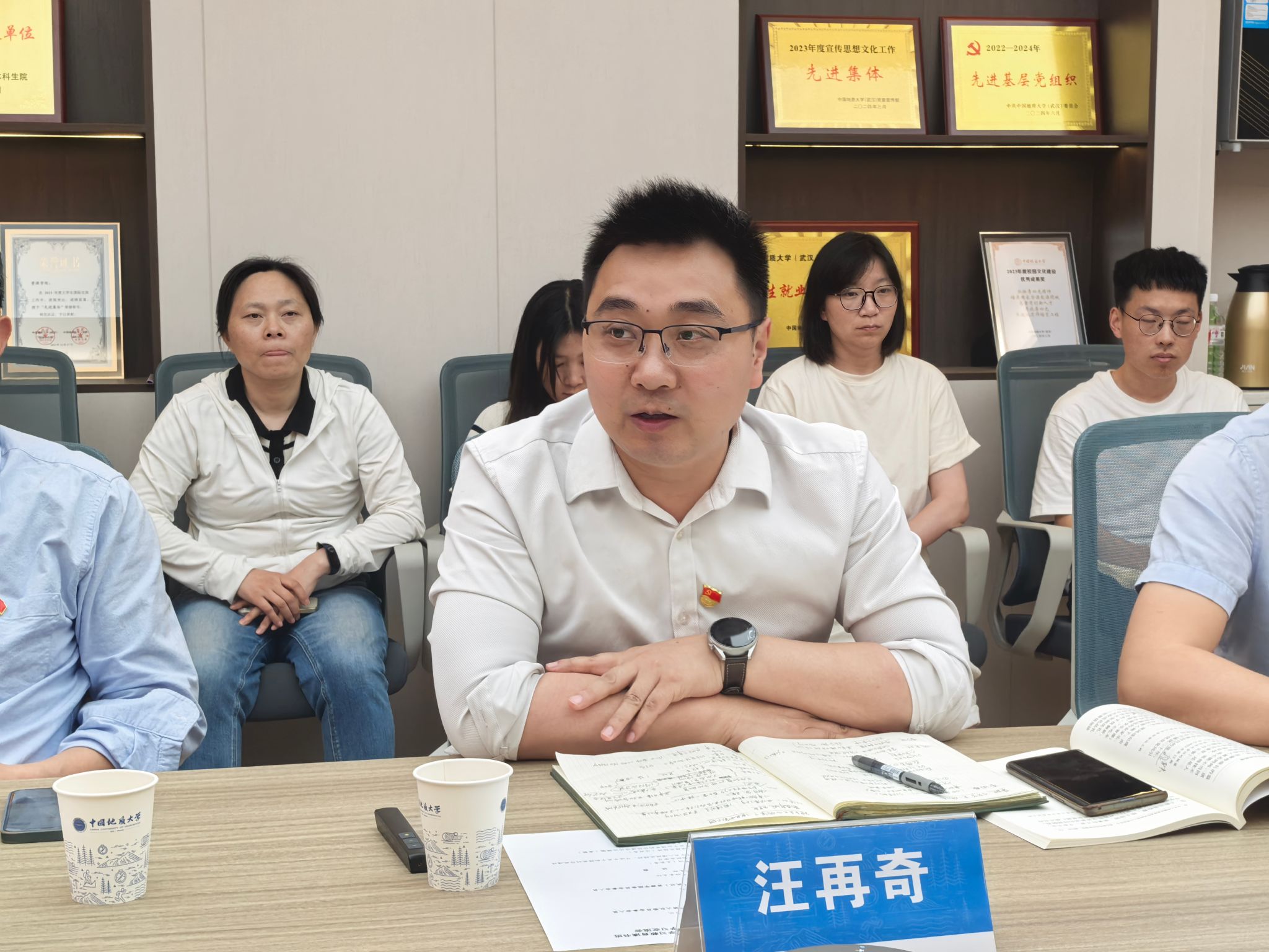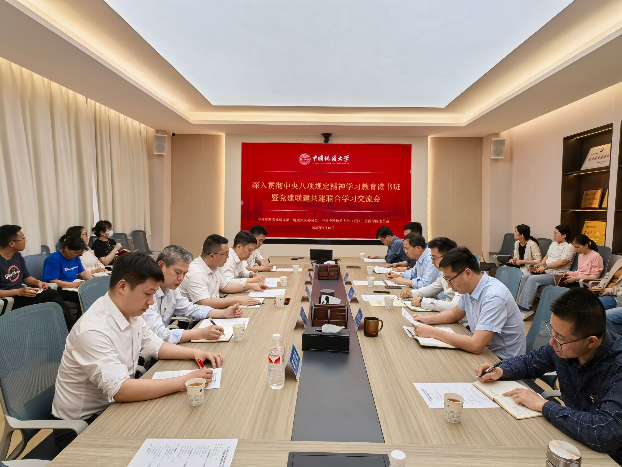 江西省地质局第一地质大队王长青、周建廷、曾广华、李国猛以及资源科学与工程系主任孙华山、系党支部书记付乐兵、系副主任靳晓野、教师代表李艳军分别发言。双方围绕深入贯彻中央八项规定精神学习教育、党建联建共建、科技创新合作发展、专业人才联合培养等方面分享经验、交流想法。大家表示,将认真学习中央八项规定精神、全面加强作风建设,持续深化校企党建联建共建、合力打造合作典范,努力推动高质量发展、开创校企共赢新局面。