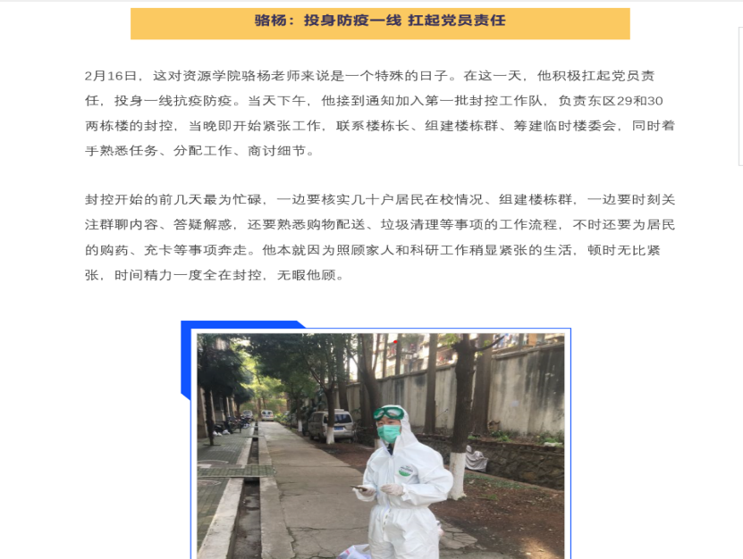 022171班参加了社区抗疫志愿活动的陈茜林同学道:“我们赞颂勇气,因为我们在最危险的时候挺身而出;我们坚守使命,因为我们在国家需要的时候负重前行;我们牢记责任,因为我们在合适的时间竭尽所能。”