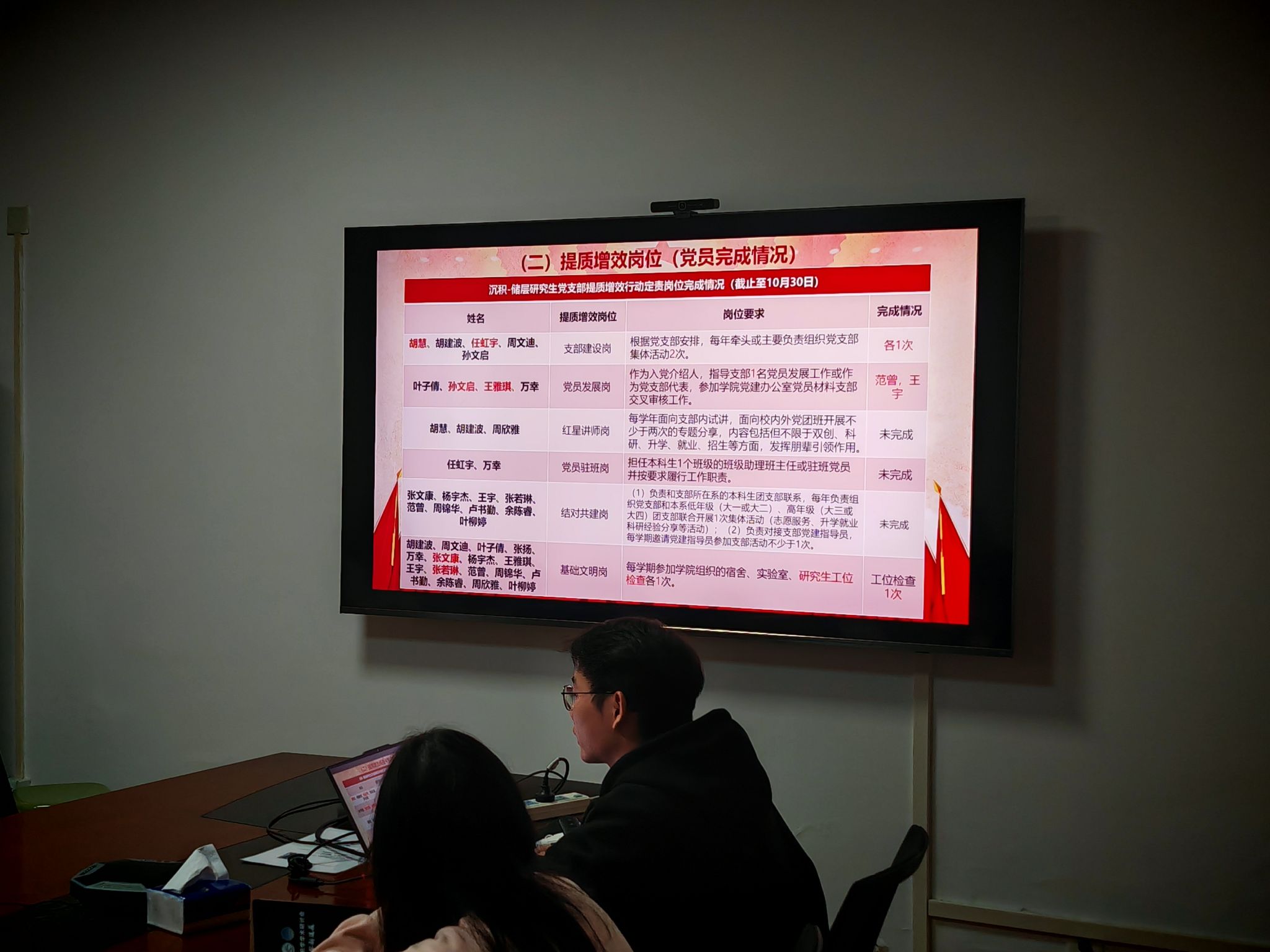 党员张文康在“基础文明岗”上负责研究生工位日常管理与用电安全巡查。他表示:“工位是科研的‘主阵地’,维护好安全整洁的环境是我们共同的责任。这份工作让我更加注重细节服务,也增强了我的奉献意识。”通过参与工位管理,强化从细微之处服务同学的意识,同时也提升自身的责任感。