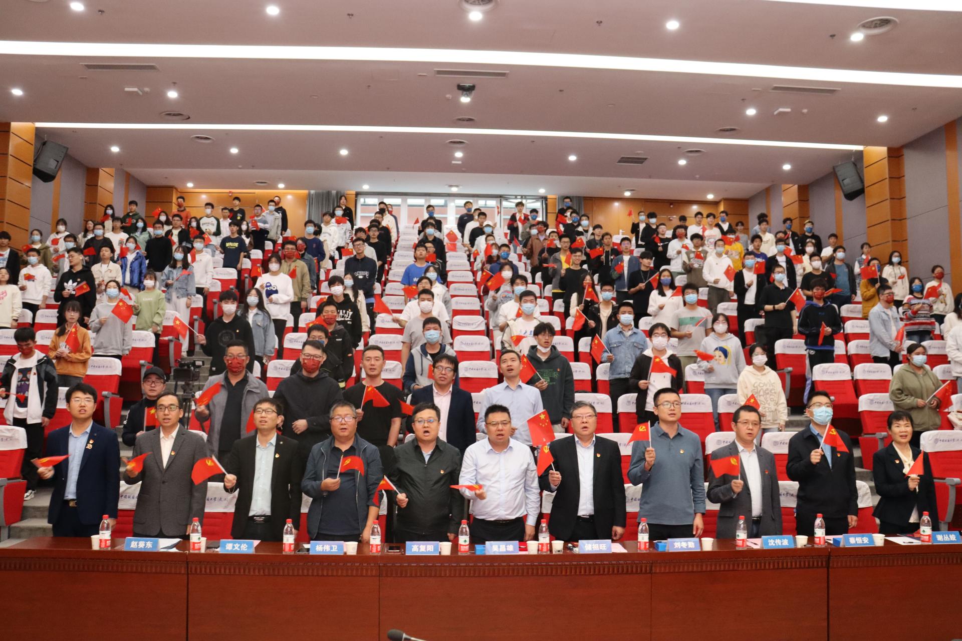 储祖旺为十大买球官方网站“资源能源宣讲团”授旗。武汉市委宣讲团成员、副院长沈传波教授,“志留纪”科普平台负责人、资源勘查工程专业2020级本科生吕骏腾代表接旗。