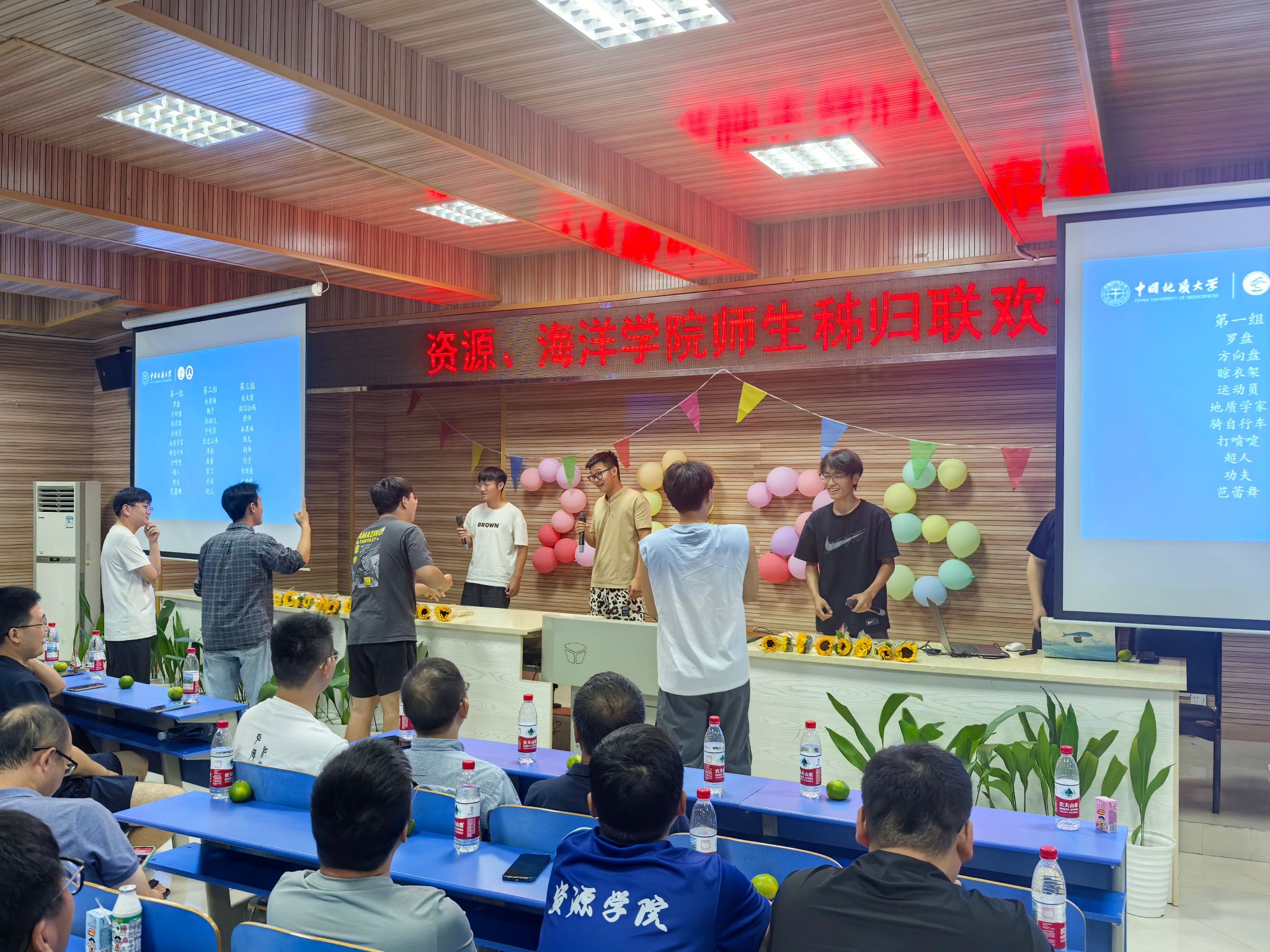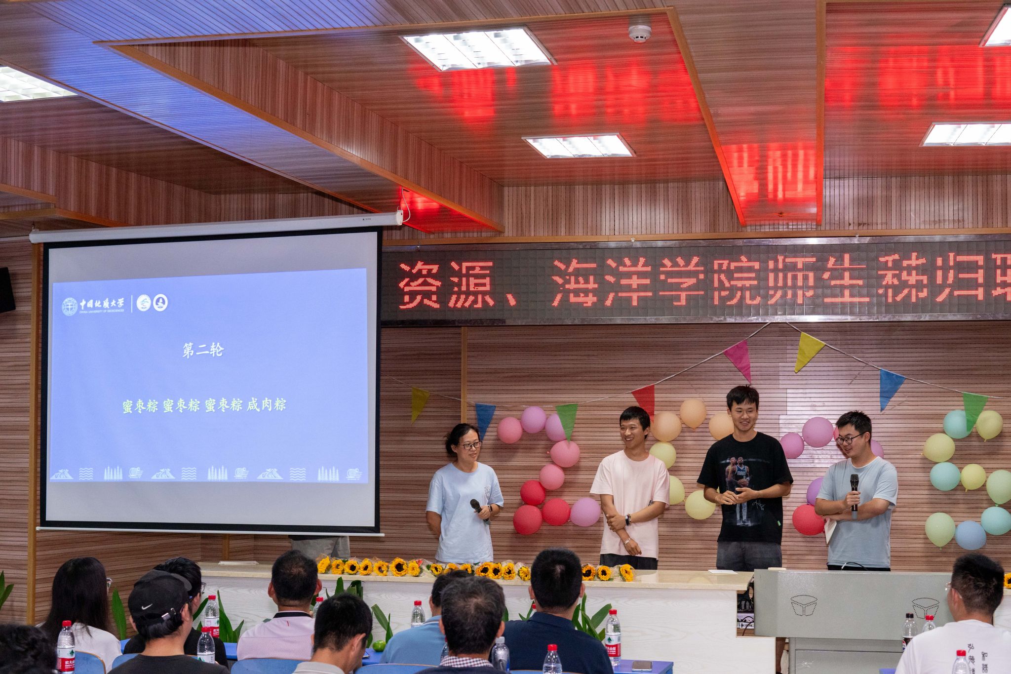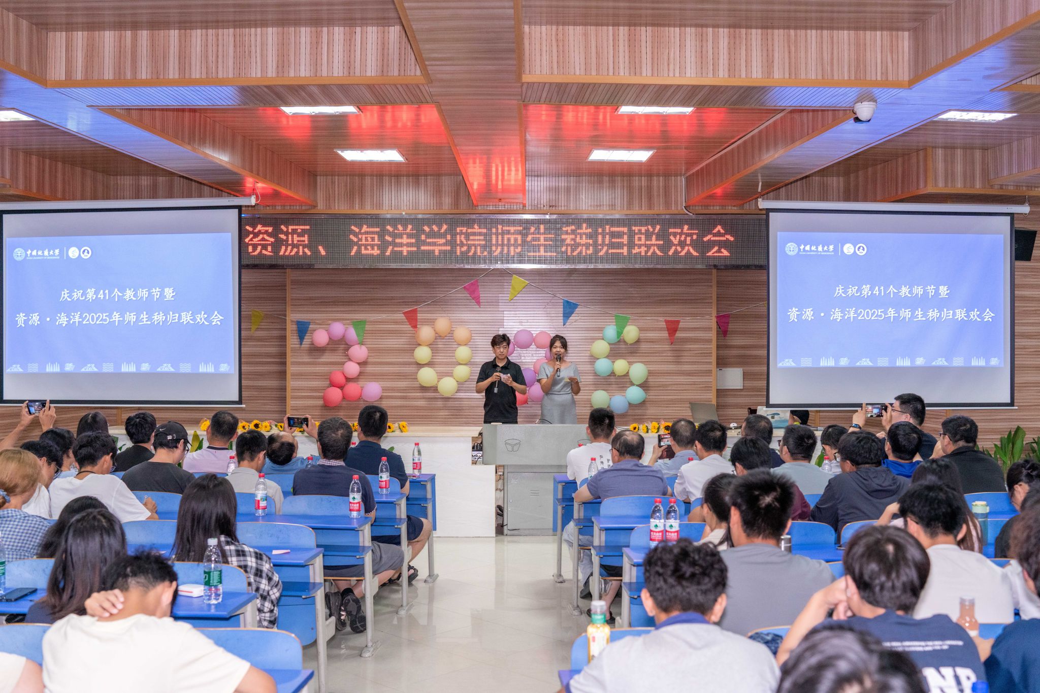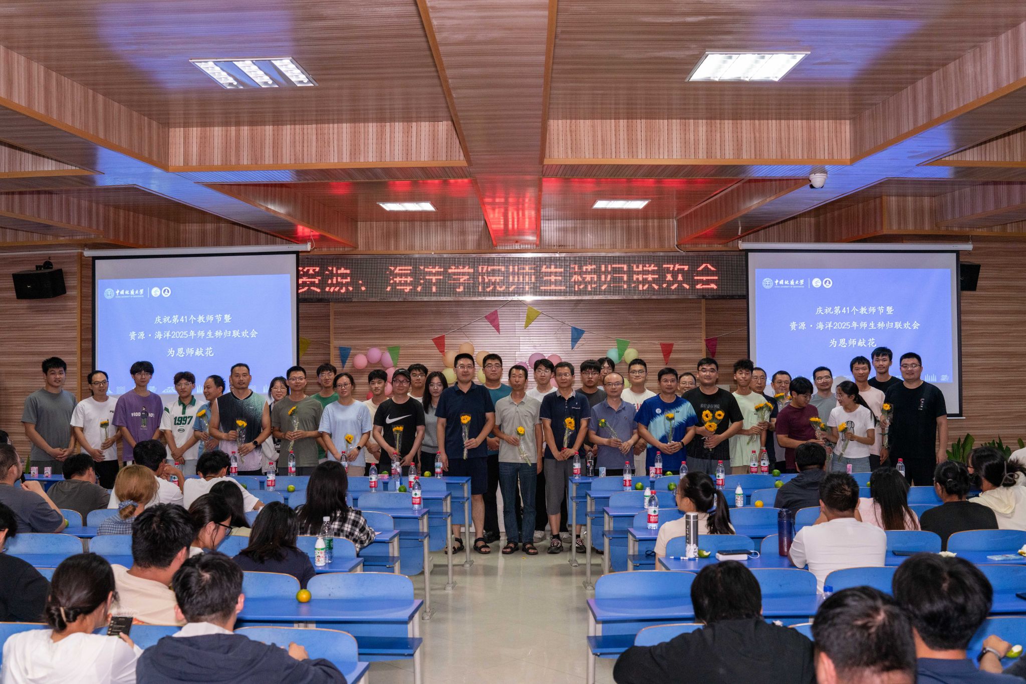 晚会的温情持续延展,主持人朗读学生手写的教师节祝福卡片:“于秭归实习,探寻地质奥秘,方知师恩如山……”字字真挚,句句动人。学生代表向两院教师献上向日葵花束,一声“教师节快乐”,凝聚了多少难以言表的感恩。