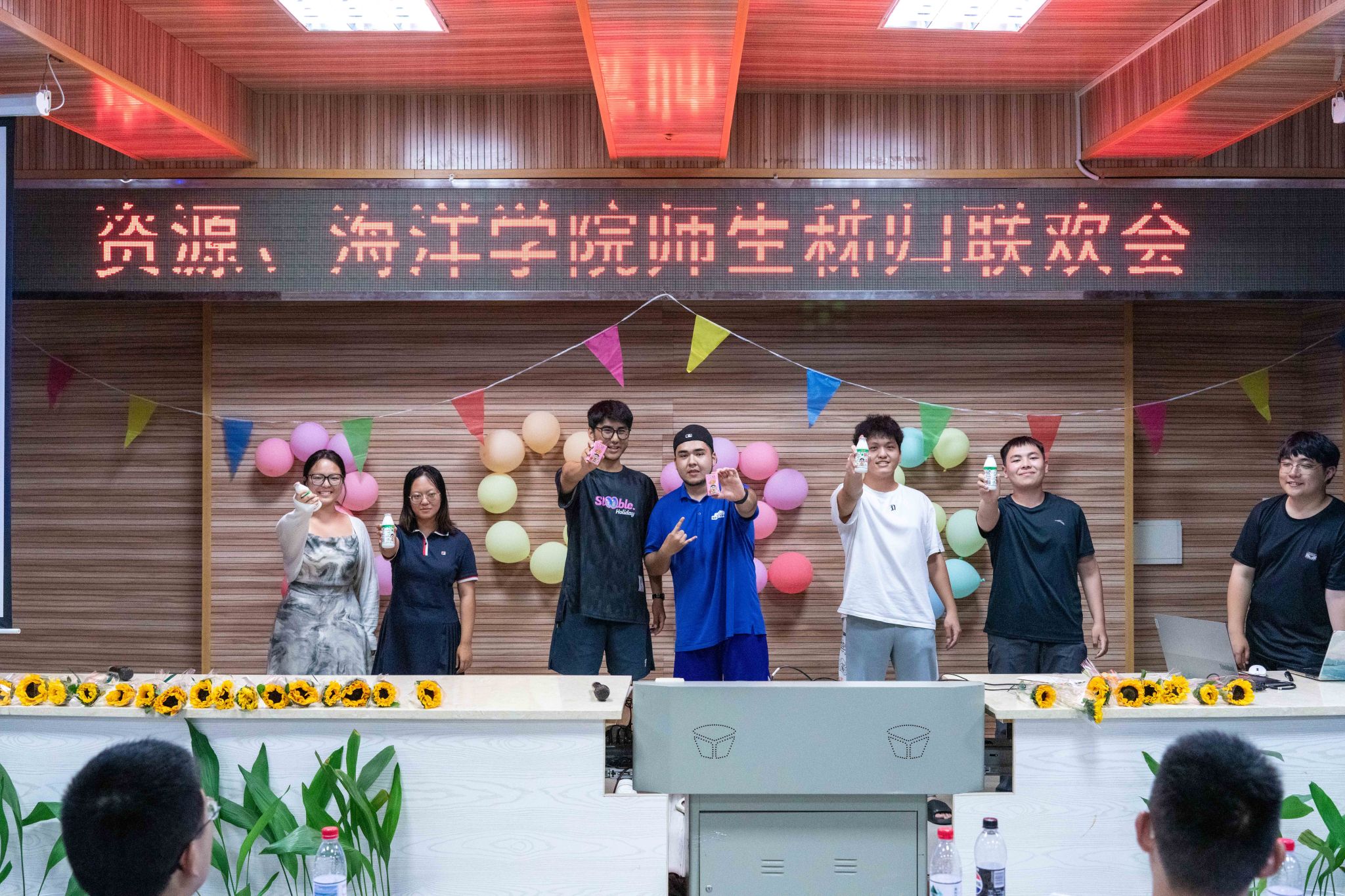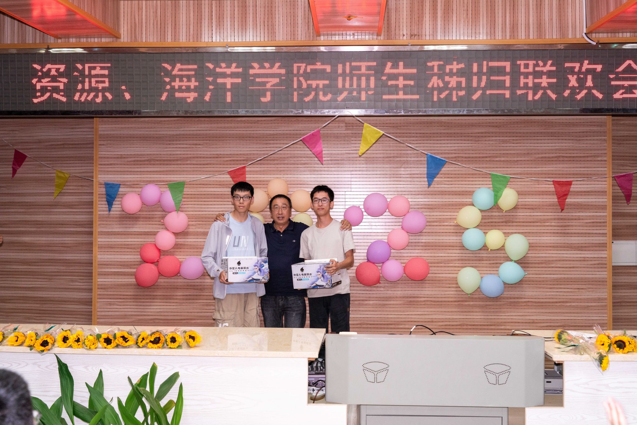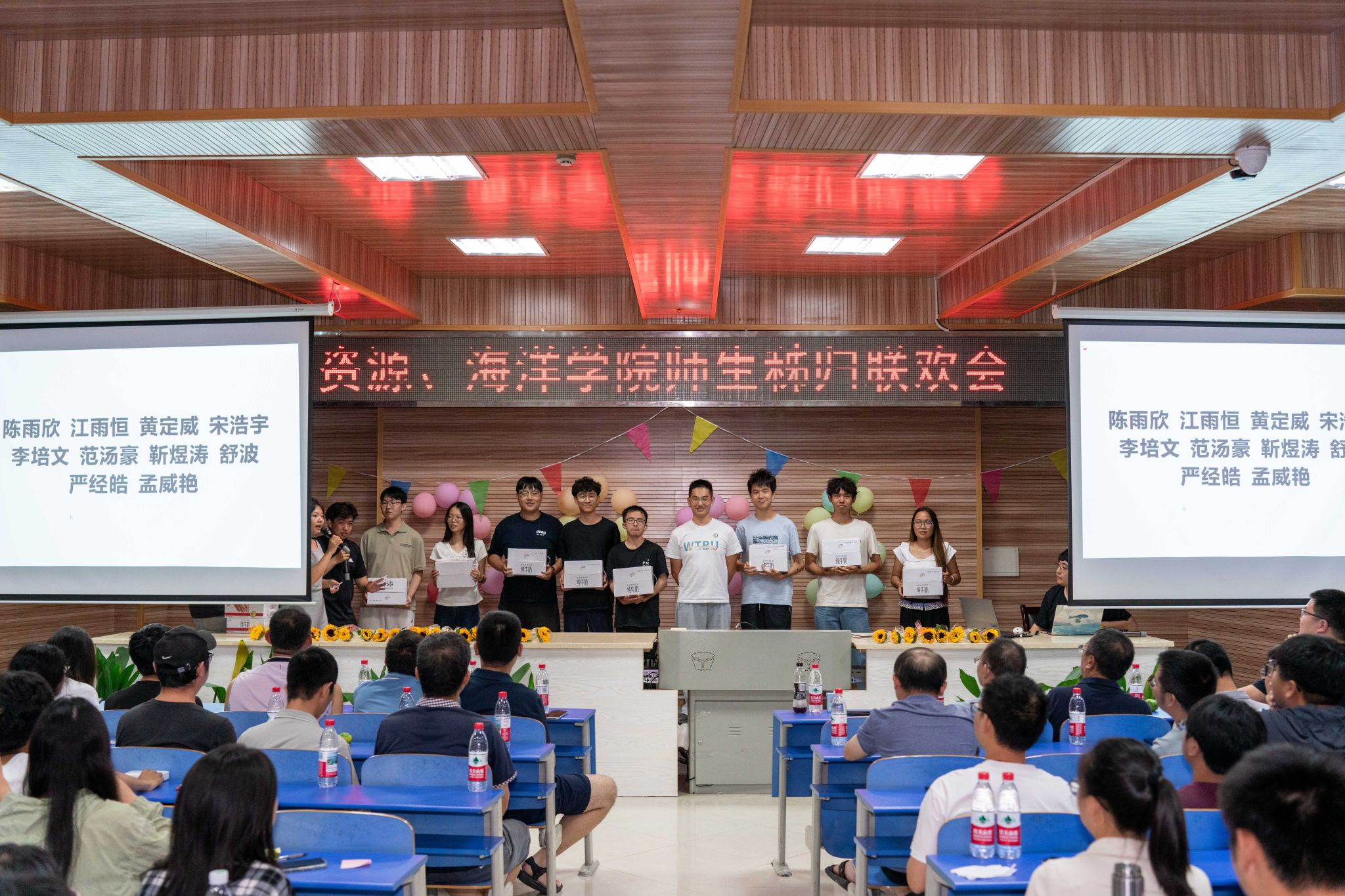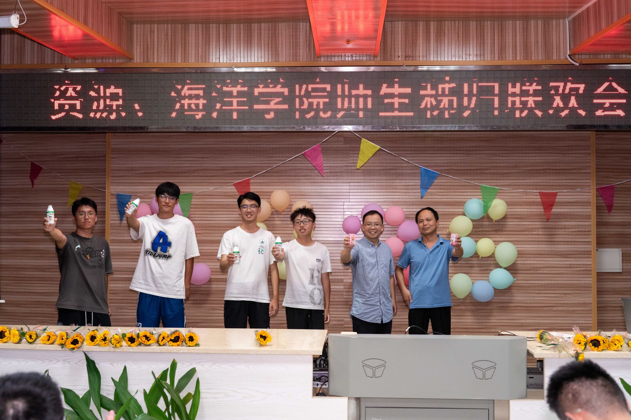 晚会的温情持续延展,主持人朗读学生手写的教师节祝福卡片:“于秭归实习,探寻地质奥秘,方知师恩如山……”字字真挚,句句动人。学生代表向两院教师献上向日葵花束,一声“教师节快乐”,凝聚了多少难以言表的感恩。