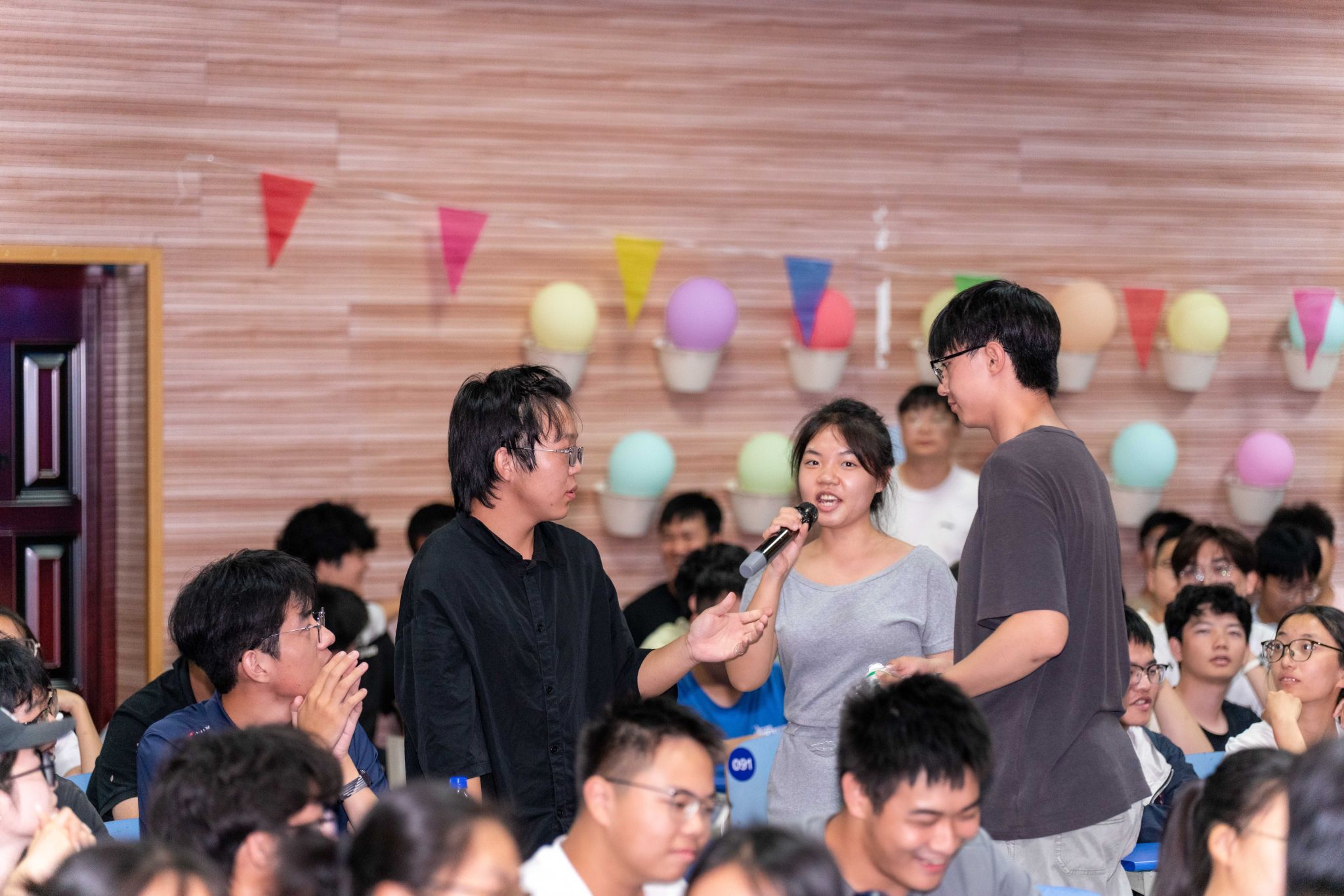 第二轮互动环节“听歌识曲”巧妙衔接,现场秒变“大型KTV”,从《海阔天空》到《我爱你中国》,一首首经典旋律引发热烈抢答,展现出师生之间的默契与活力。