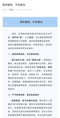 激发网络正能量,舒缓学生情绪,增强学生信心。学生党建工作办公室致全体党员《坚持赢得胜利 团结开创未来》,倡议全体学生党员在思想认识、遵规守纪、发挥作用上走在前列,做守责担当的“笃行者”,做冲锋在前的“实干家”,做苦练本领的“追梦人”。学生会、研究生会致全体学生《乘风破浪,不负春光》,倡议同学牢记使命担当、严守防疫政策,聚焦主责主业、不负美好春光,努力提升自己的专业知识和科研本领,参与体育运动,释放青春激情。
