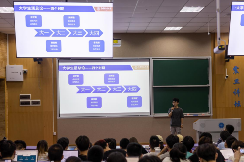 会上,聂思嘉以“逆风唯行 顺风化诗:我的大学蜕变之路”为题做分享。他从个人履历、大学生活总论、专业学习、学生工作、实践锻炼、课外拓展等六个方面讲述了从失意到争渡、从初识到热恋,在持久奋斗中赢得灿烂的大学时光。