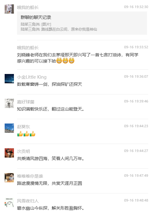 刘晓峰老师出句:路线飘在白云间,原来你我是神仙。