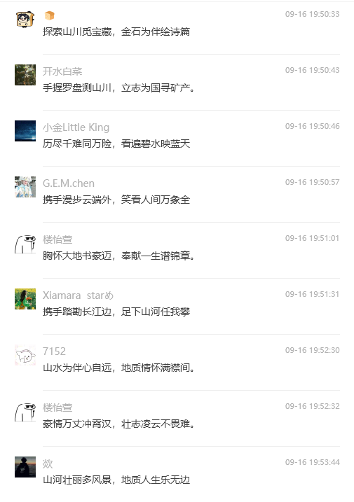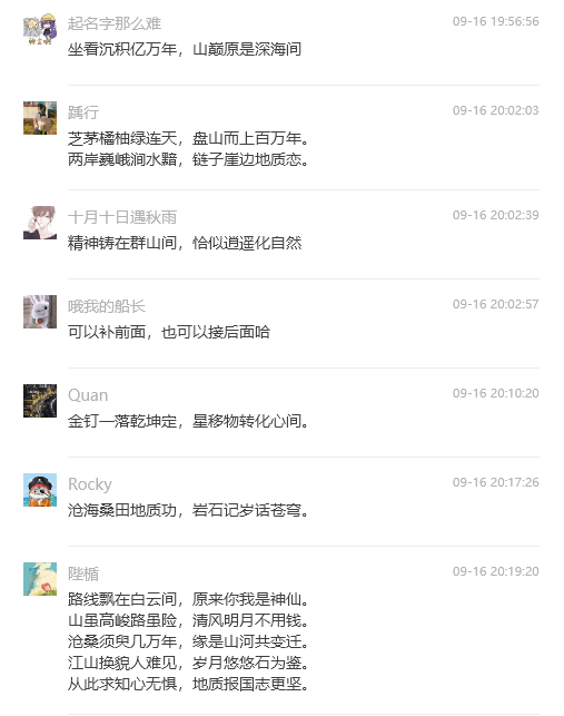 一石激起千层浪,百余首地质诗歌在秭归地质实习基地即兴创作。9月15日的茅垭公路云雾缭绕,十大买球官方网站2022级学生在秭归茅垭村开展地质实习。秭归实践教学团队学术指导刘晓峰老师随队在茅垭村路线中触景有感,即兴吟诵两句七言诗:路线飘在白云间,原来你我是神仙。这两句简短却意境深远的诗句一经转发至实习班级群,便立即引发了同学们的热烈反响和积极参与。在接下来的50分钟里,班上30位同学纷纷作诗对句,将自己对地质实习的感受和对自然之美的感悟融入其中。“手握罗盘测山川,立志为国寻矿产”“携手踏勘长江边,足下山河任我攀”“山水为伴心自远,地质情怀满襟间” “地壳变迁岁月长,岩层叠嶂见沧桑” “芝茅橘柚绿连天,盘山而上百万年” “金钉一落乾坤定,星移物转化心间”等等。同学们以诗传情,以地质为语,不仅展现了地质科学的严谨与浪漫,表达了学生们对地质学科的热爱,更传递了地质人勇于探索、不懈追求的精神风貌,增强了大家作为新时代地质人的身份认同感和使命感。