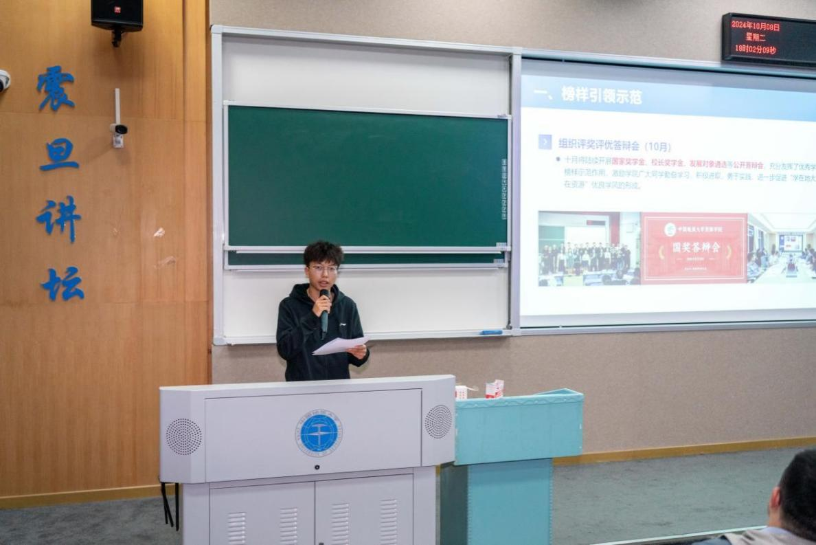 9月29日晚上,十大买球官方网站举行2024学年度国家奖学金候选人答辩会暨“榜样引领 青春领航”主题团日活动。16位国家奖学金候选人分别从思想品德、学业成绩、科研实践、志愿服务、社会实践等多方面进行展示,展现了资源学子求实进取、勇攀高峰的优秀品质和全面发展的综合素养,激励2024级资源新生在学业道路上凝聚力量,勇毅前行。