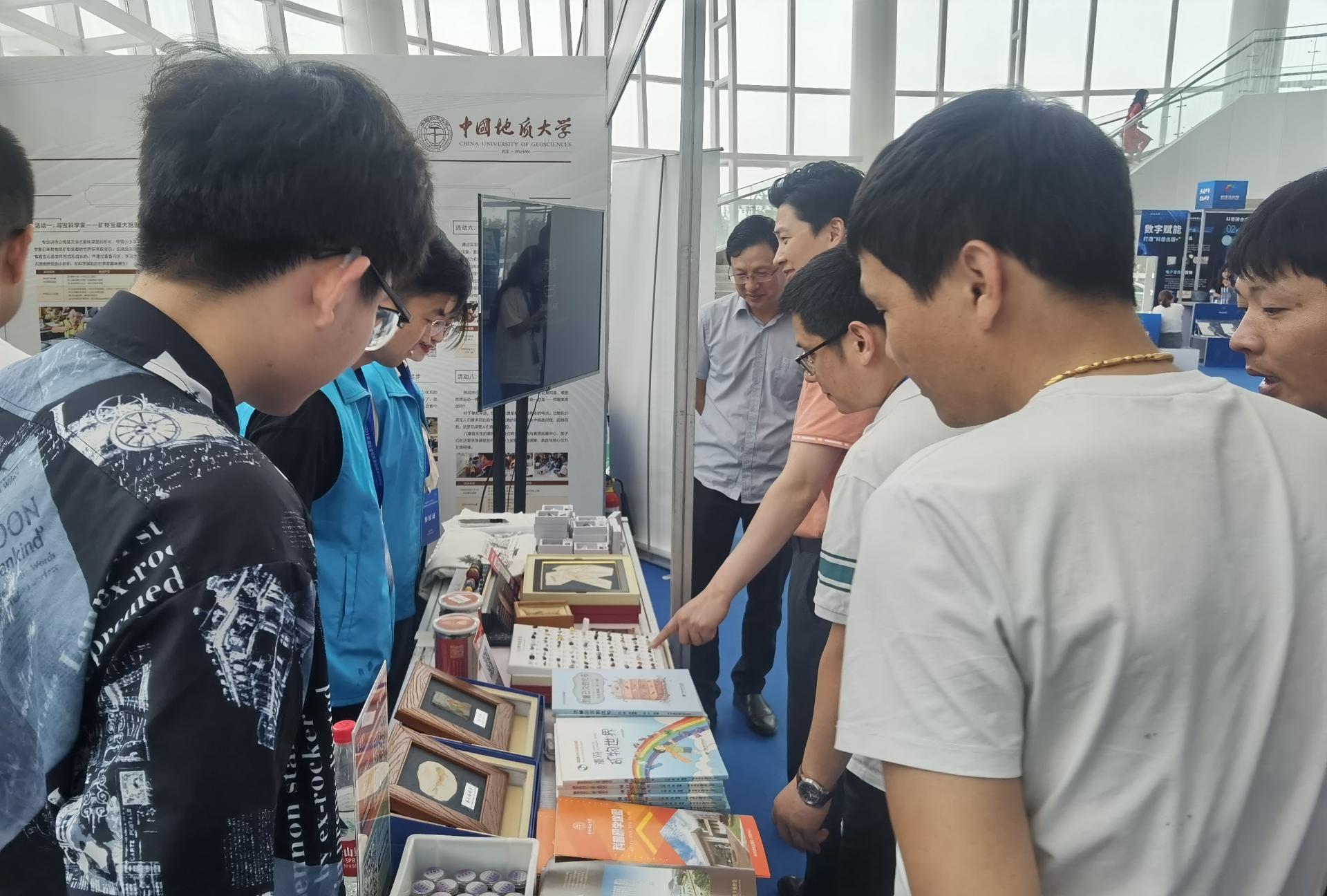 在展演现场,我院科普志愿者向与会人员和公众介绍紫水晶、萤石、玛瑙等矿物的矿物特征,讲述科普研学课程,并利用矿产资源形成与勘查开发VR技术展示地形构造、火山作用、空间科学等虚拟数字模型,受到了热烈欢迎。