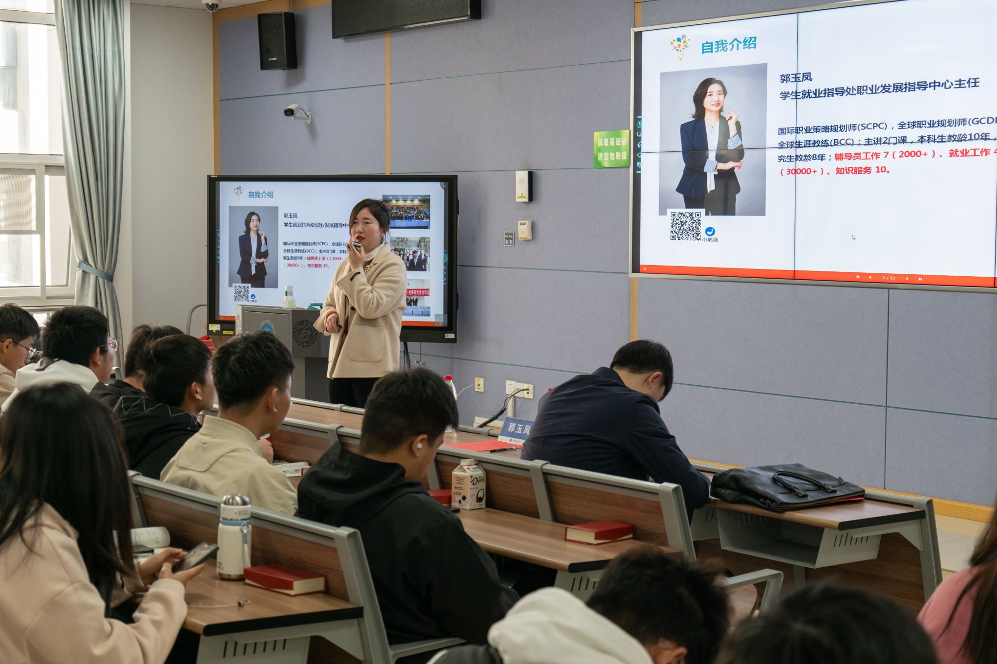 郭玉凤以“团学活动设计思维力的提升”为题,点明了作为学生干部应具备文明的形象、扎实的专业等能力,她通过活跃的提问和观看视频,形象阐释了思维力的大小、方向、作用点三个要素,并着重介绍了“5W2H”七问分析法,以提高工作效率,增强学生工作思维力。最后她希望大家不仅要有知识和技能,更要有才干而脱颖而出。