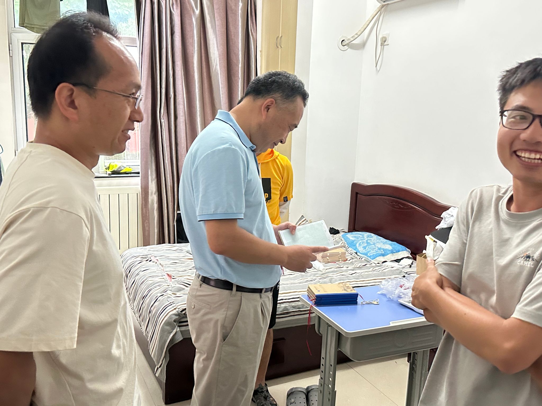 随后,朱红涛一行来到教师公寓看望实习队教师。他代表学院向实习老师在假期依然在进行野外实践教学表示感谢,详细了询问出野路线规划、日常教学安排及实习整体进展。他仔细查看了学生的野簿,并指出:野外实践教学是学校和学院人才培养的重要环节,老师们要精心设计教学内容,引导同学们在实习实践中爱上地质,建立专业自信。同时,各位带班教师和辅导员一定要高度重视安全工作,确保本次实习圆满顺利。
