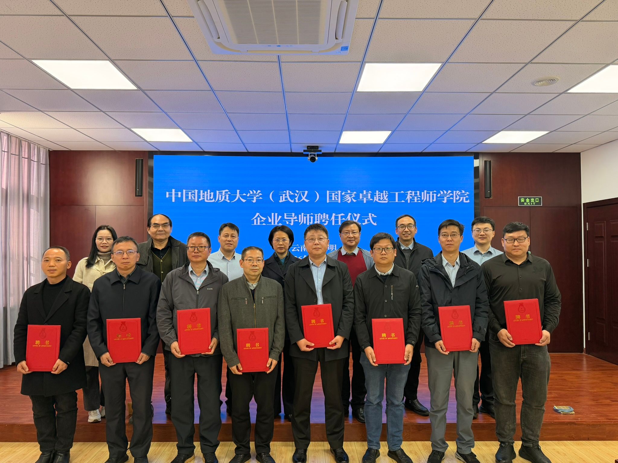 会议举行了导师聘任仪式。云南省有色地质局的8位专家受聘担任学校的企业导师。