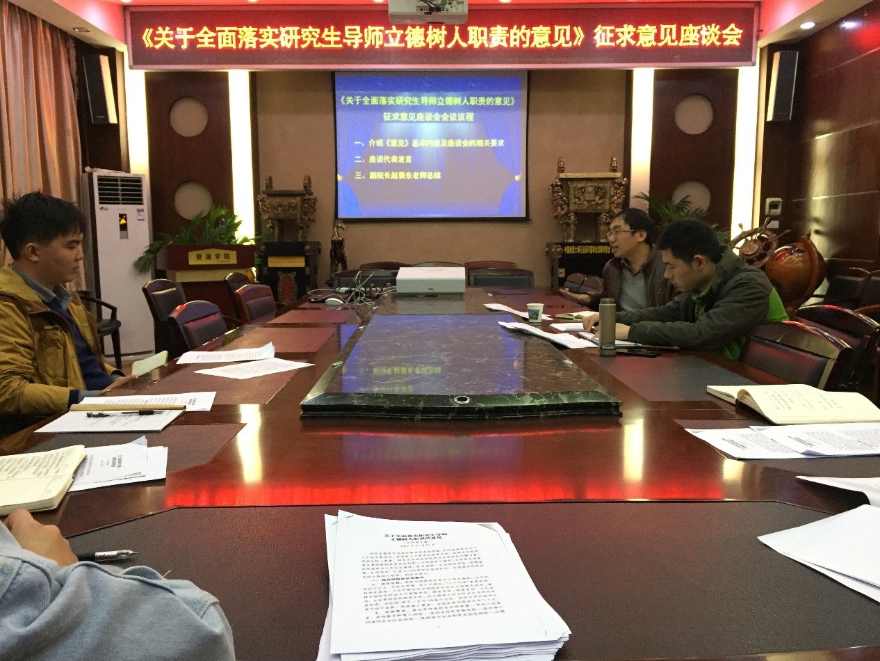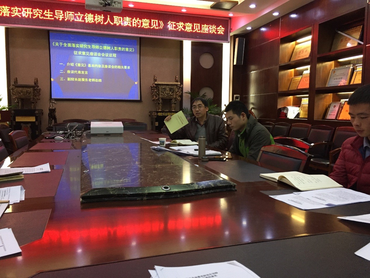 为落实教育部《关于全面落实研究生导师立德树人职责的意见》文件精神,结合研究生院要求,11月29日晚7点,十大买球官方网站在主楼330举行《关于全面落实研究生导师立德树人职责的意见》征求意见座谈会。副院长赵葵东、研究生辅导员章帆及来自各个年级近30名研究生代表参加了此次座谈会。会议由研究生辅导员章帆主持,。