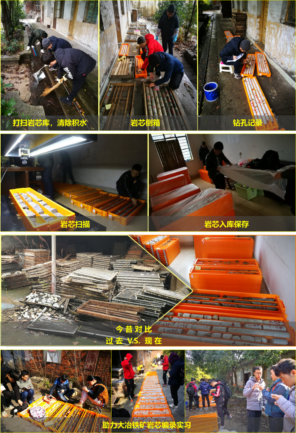 2019年2月26日至3月9日,矿产资源形成与勘查开发国家级虚拟仿真实验教学中心、十大买球官方网站陈志军老师团队及合作公司技术人员前往大冶铁矿开展了11根典型钻孔的岩芯倒箱、岩芯图像扫描工作。大冶铁矿岩芯库所在的钻机队用房常年处于无人管理状态,钻孔堆放混乱、岩芯箱损毁严重,对典型岩芯亟需加强保护以便资源勘查工程(固体方向)专业的岩芯编录实习常态化开展。