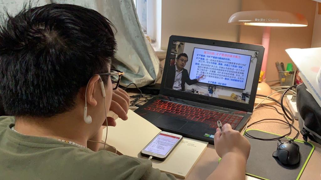 学生在家用电脑观看《矿产勘查理论与方法》课程直播,同时用手机看PPT和做笔记