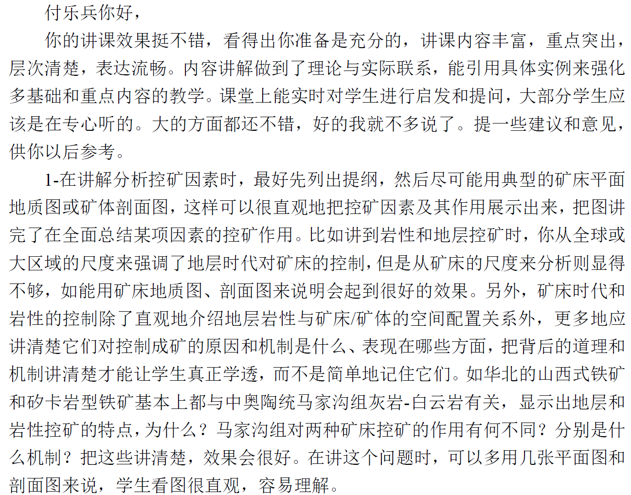 在谈及同行专家参与听课的意义时,《矿产勘查理论与方法》任课教师刘文浩表示:“徐思煌教授听完课和我交流,建议增加更多的提问和学生的交流互动,促进每个学生学习的积极性。我认为徐老师提的意见很中肯,切实指出了当前网课教学的问题所在,主要是如何更有效地和学生开展交流,在下一步网络教学过程中我会注意设计更多的问题,穿插于课堂教学中,以提升学生学习的积极性,促进网络课堂中师生的交流”。作为初始承担教学工作的新人,《非常规油气地质学》任课教师董田谈到:“讲课是一门艺术,需要不断的探索和提升,特别是在当前“疫情”情况下,利用现代网络工具,积极提升讲课技能,提高线上教学质量。将复杂的知识简单化,将枯燥的知识生动化、形象化,同时积极探索授课方式的多样化”。《采油(气)工程》任课老师杨峰谈到:“在线教学对自己而言是一个比较大的挑战,要把每一堂课当成教学竞赛,认真备课,认真准备,认真教学,精炼知识点,加强知识点的联系,构建知识树,形成系统,同时适时提高课程趣味性方便学生理解记忆”。 《油(气)层物理学》任课老师王金杰到:“在线教学,把不能按时开课的‘危机’,化为了推进教师教学理念、教学方法改革的‘契机’;直播课堂上,时不时地咨询同学们的听课感受,争取更好的教学效果。”《矿产勘查理论与方法》任课老师付乐兵谈到:“李院长听课给我提出的意见,不仅包括了课堂组织、讲授技巧等教学基本功,还涉及到案例选取、进展介绍、英文专业术语拓展等非常具体和专业的教学内容,这对于年轻教员来讲非常难得,既是督促,也是绝佳的学习机会,必然会促进我本人对相关技巧、课程内容进行进一步的反思和调整”。