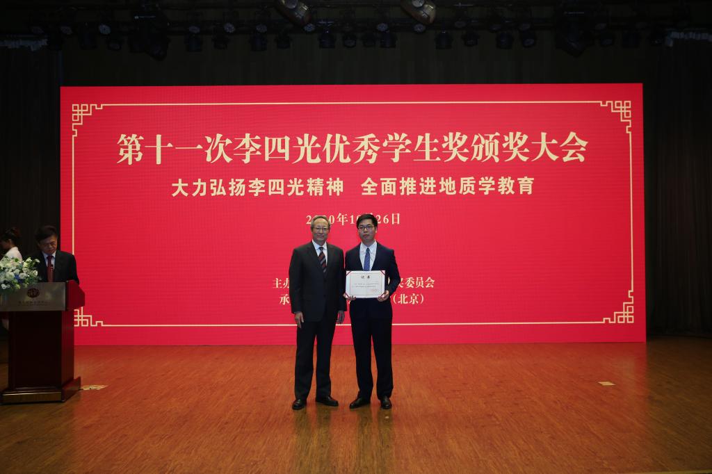 10月26日,第十一次李四光优秀学生奖颁奖大会在北京举行,我院矿产普查与勘探专业2017级硕士研究生苟启洋获评李四光优秀学生奖提名奖,近三年,我院共有4名学子荣获李四光优秀学生奖。