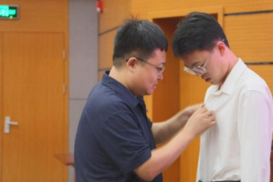 院党委书记高复阳老师为新生代表佩戴院徽。