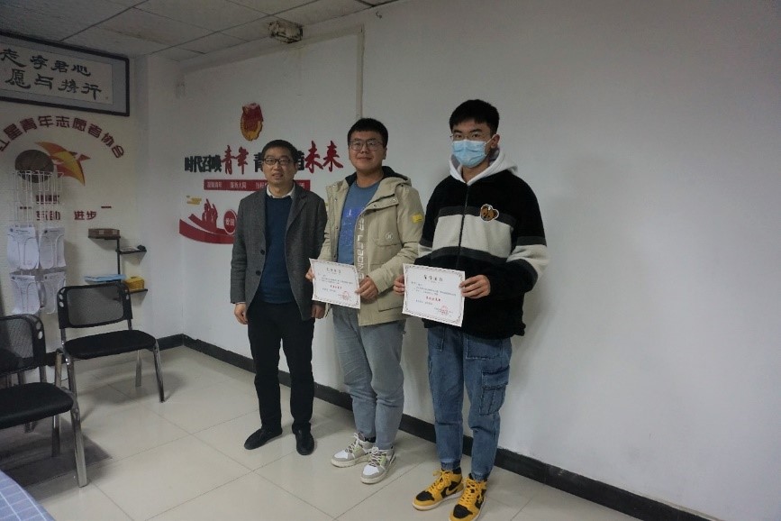 谭文伦为021215班蔺拓、021203班韩键润、020191班池久贤、021184班柴正仿颁发“最佳献策奖”。