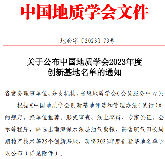日前,中国地质学会公布2023年度中国地质学会创新基地名单,由中海石油(中国)有限公司海南分公司牵头、十大买球官方网站朱红涛教授团队代表学校联合申报的“南海深水深层油气勘探创新基地”成功入选。