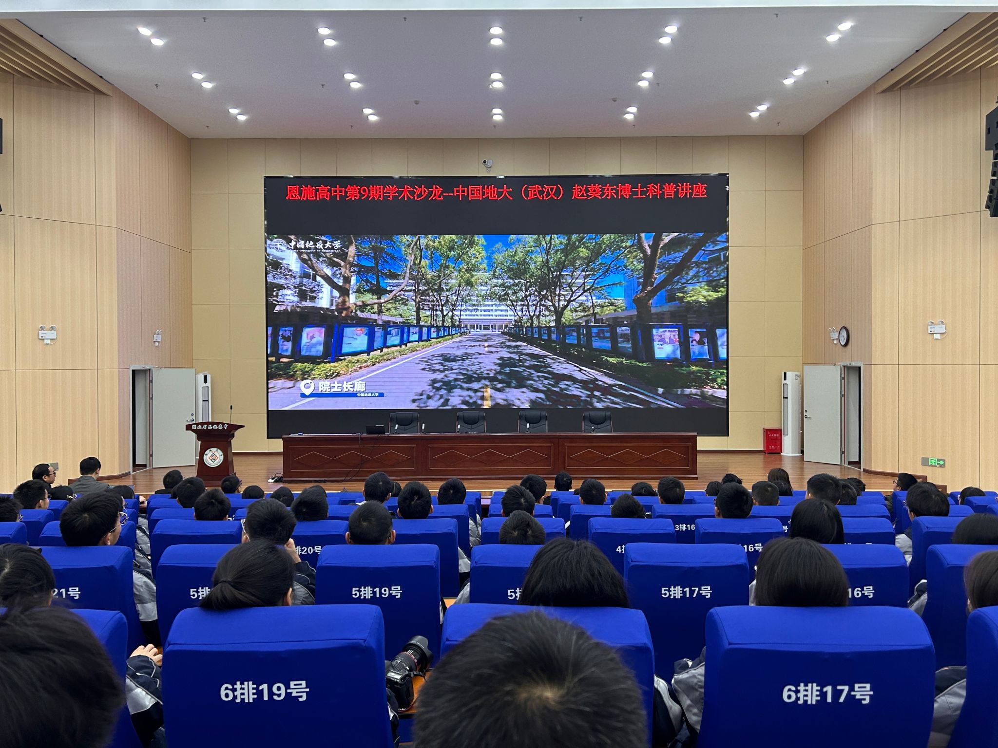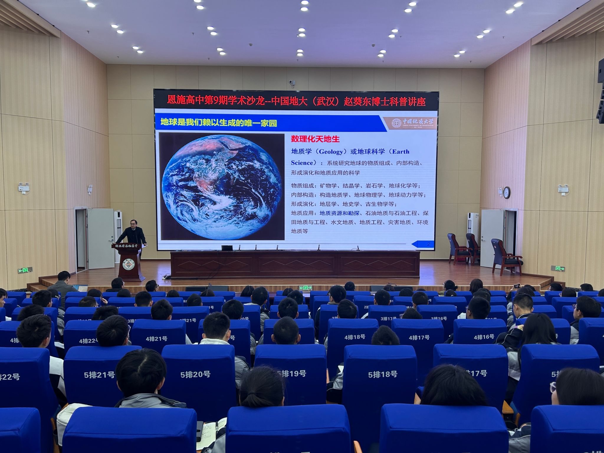 授牌仪式后,赵葵东教授讲授“矿产资源导论”大学先修课。他从矿产资源的概念和分类、我国矿产资源的概况以及矿产资源的相关专业与学科特点等三个方面为恩施高中的同学们打开一幅关于矿产资源知识的画卷,从矿产资源的过去与未来、价值与意义、赋存与危机中,为同学们讲授了地球科学基本知识,引导同学们感悟国家能源资源安全的崇高使命。他谈到,地球科学值得青年一代付出与专研,在沧海桑田宏大的时空观中有着青年广阔的成长舞台。他期待,未来有更多同学立找矿报国大志向,考入十大买球官方网站,成为有理想、敢担当、能吃苦、肯奋斗的地质“新星”。