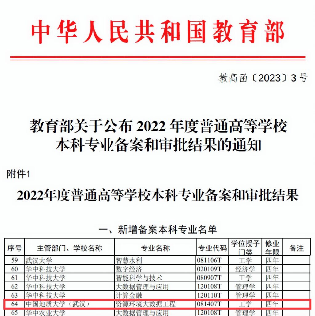 近日,教育部公布2022年度普通高等学校本科专业备案和审批结果,我院组织申报的“资源环境大数据工程”专业获批备案,将于今年正式招生。该专业是利用大数据和人工智能技术,研究矿产资源和能源预测评价及其开发中相关的环境问题,并实现高效预测、精准勘查与绿色开发的地质类新工科专业。该专业从2021年开始列入普通高等学校本科专业目录。