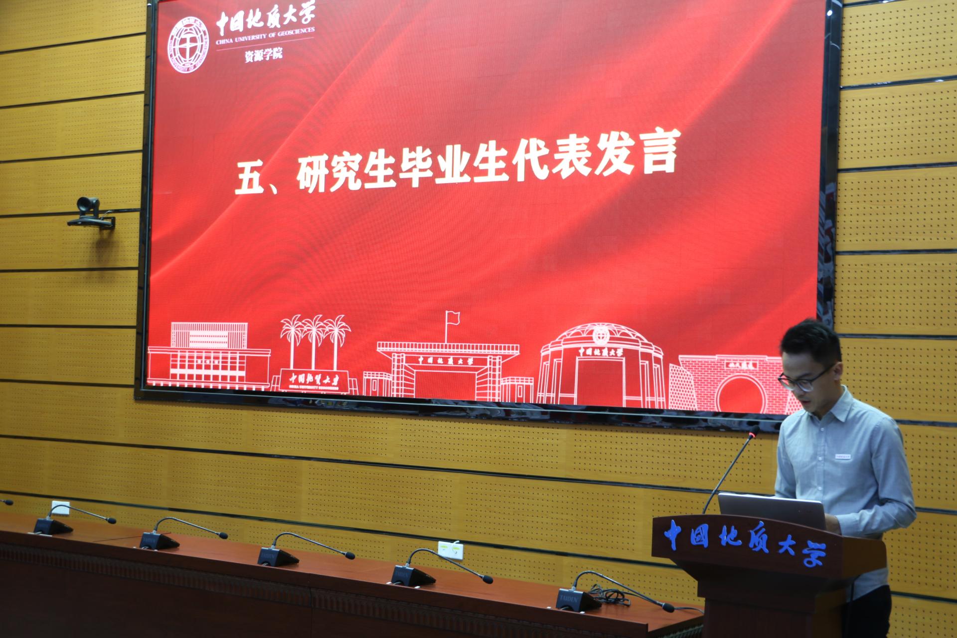 研究生毕业生代表、地质资源与地质工程专业程茂策发言。他谈到地大不仅是一个学习的地方,更是收获了许多宝贵友谊和人生经验的地方。地大给大家提供了广大的舞台去实现梦想。无论走得多远,“艰苦朴素 求真务实”的校训都会深深烙印在地大学子的心里,“求实进取 勇攀高峰”激励着学子在追求真理的道路上阔步前行。
