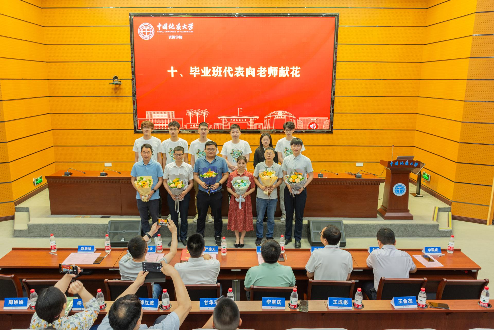 毕业班代表向班主任、辅导员、导师献花。感恩老师们一路的辛勤培育和悉心培养。