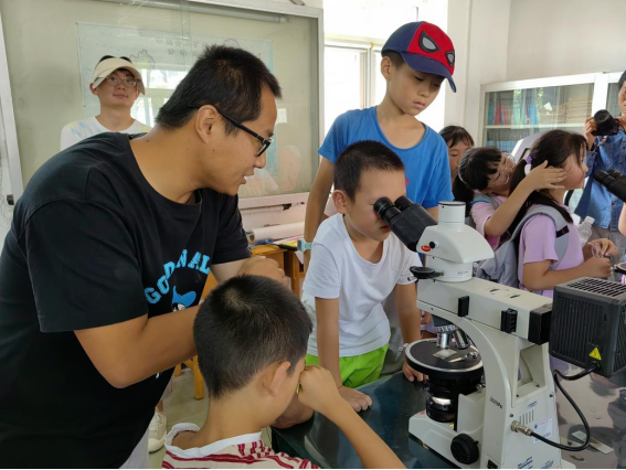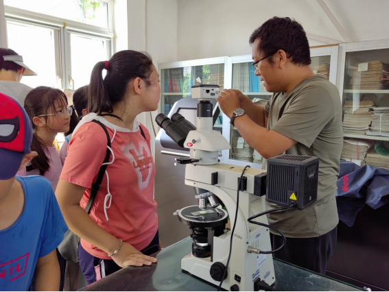 在光学显微镜观察室,刘文浩、俎波、吴亚飞3位老师带领同学们观察花岗岩、片岩、灰岩等岩石薄片。当岩石被切到0.03mm,石榴石、红柱石、云母、斜长石等矿物以透明样态展现在同学们眼中,为同学们打开了全新的矿物世界。微观世界中矿物的奇特形态和缤纷色彩,引发同学们的阵阵惊呼:“太神奇啦!”