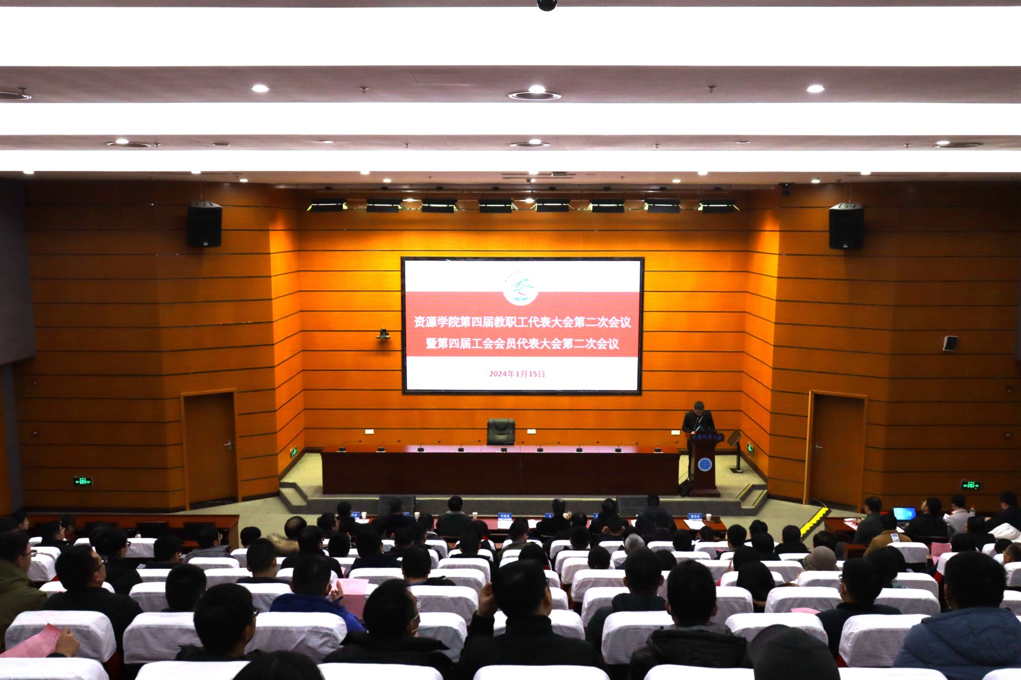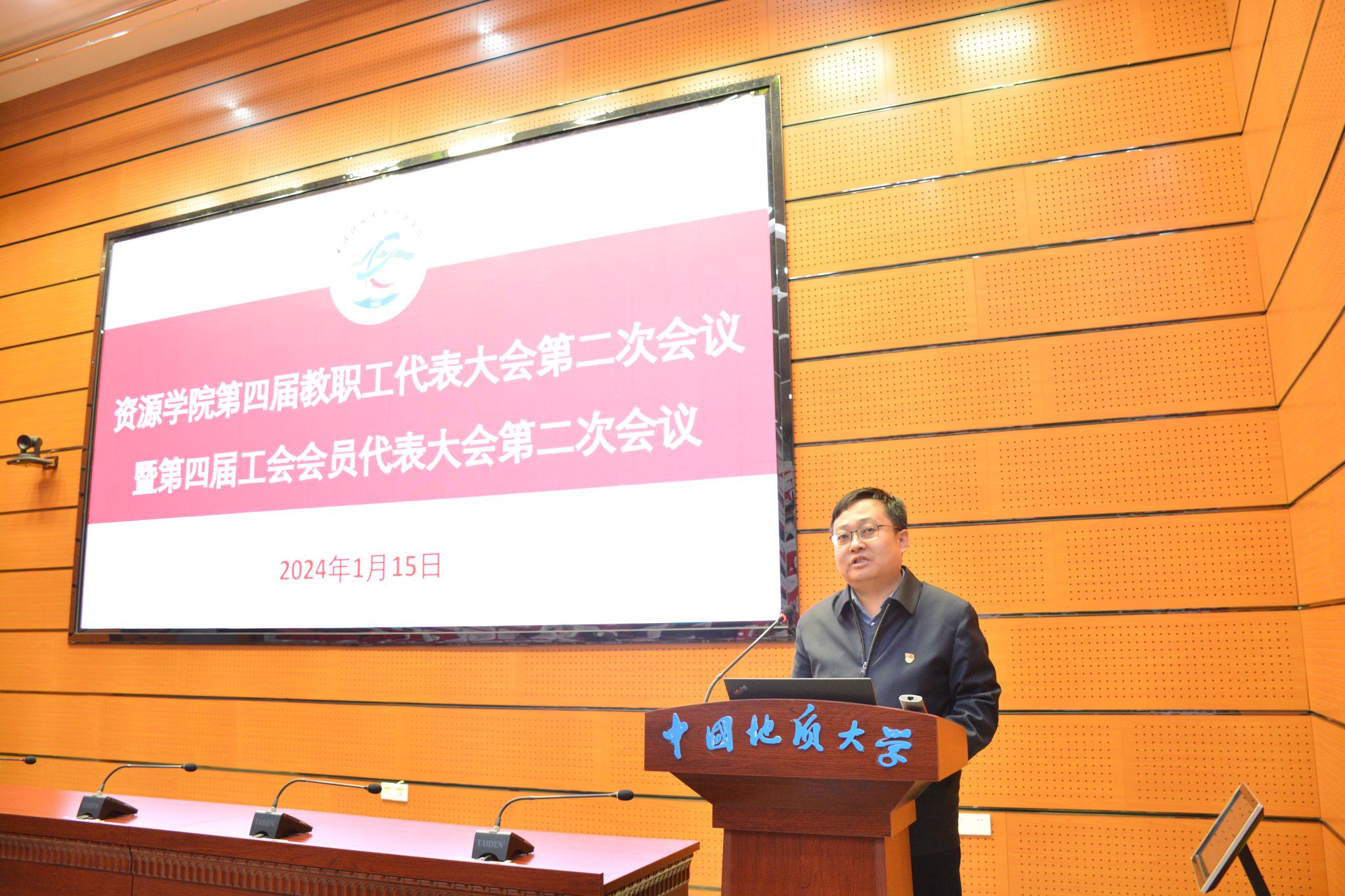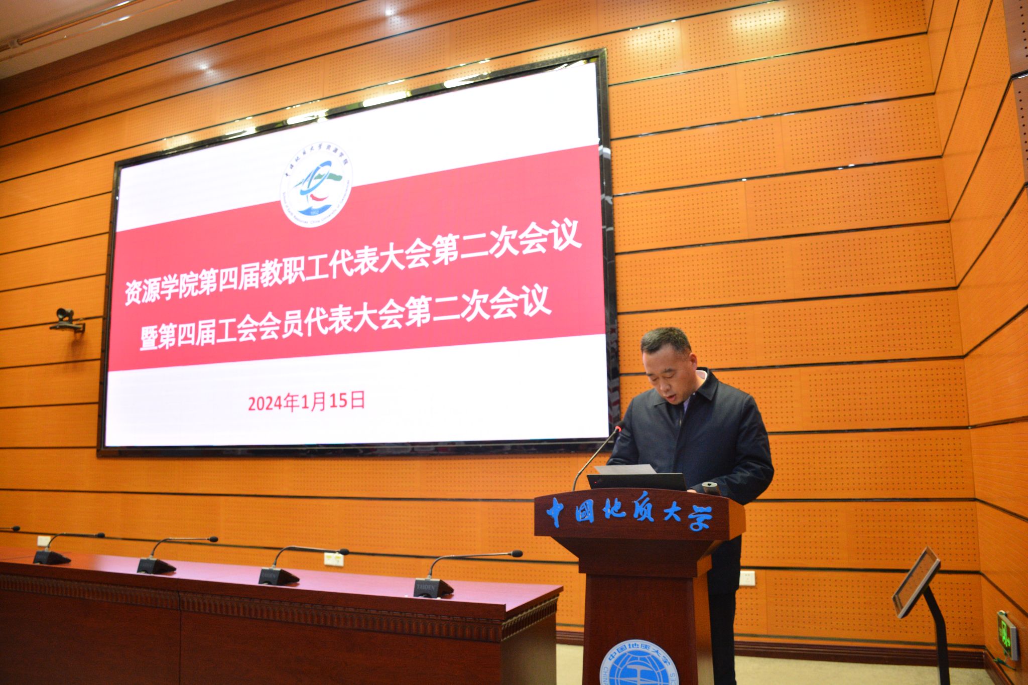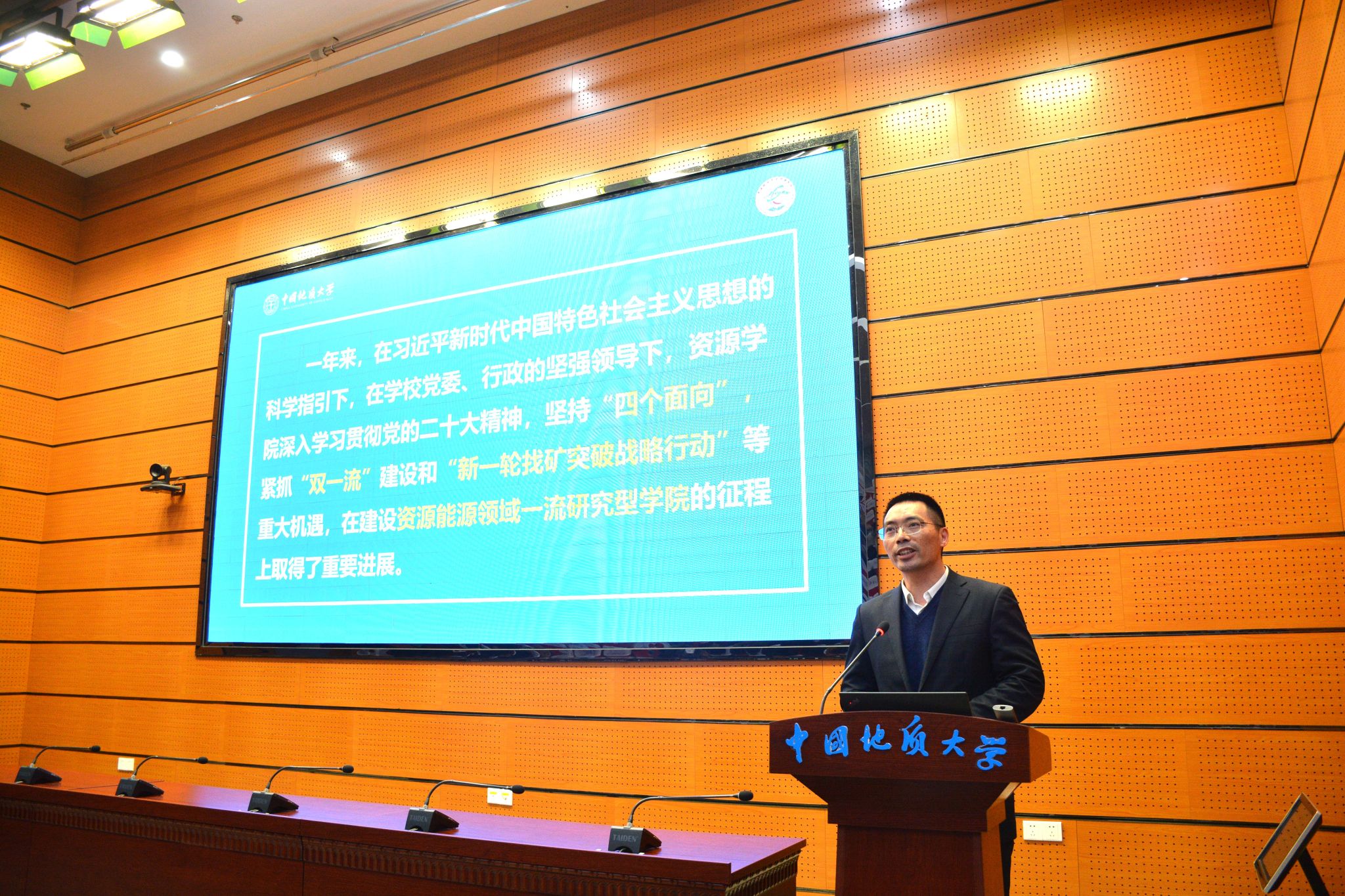 院长严德天作学院2023年度工作报告。报告从党建与思想政治、学科建设、师资建设、教育教学与人才培养、科学研究与社会服务、实验室与平台建设等方面对2023年的工作进展和主要成绩进行了全面回顾和总结,分析了新形势下学院事业发展面临的重大机遇和现实挑战,明确了下阶段工作总体思路、重点任务和具体举措。他讲到,学院在过去的一年里,坚持以高质量主题教育推动高质量发展,深入学习贯彻党的二十大精神和习近平总书记重要回信精神,贯彻落实学校第十三次党代会决策部署,紧抓“双一流”建设和“新一轮找矿突破战略行动”等重大机遇,坚持和加强党的领导,打造一流党建工作体系,大力加强学科、人才与师资队伍建设,全面推进一流本科建设,持续加强和改进研究生培养管理,深入推进有组织科研,持续拓宽行业科教服务和国际合作交流,积极改善办学基本条件,有力加强双创和校友工作,在建设资源能源领域一流研究型学院征程上取得重要进展。他表示,学院将持续深化综合改革,推动更高水平开放、更深层次改革、更高质量发展,为学校建设地球科学领域世界一流大学、服务国家资源能源事业高质量发展贡献智慧和力量。接着,严德天向大会报告了学院2023年度财务情况并介绍了年度绩效考核奖励方案。