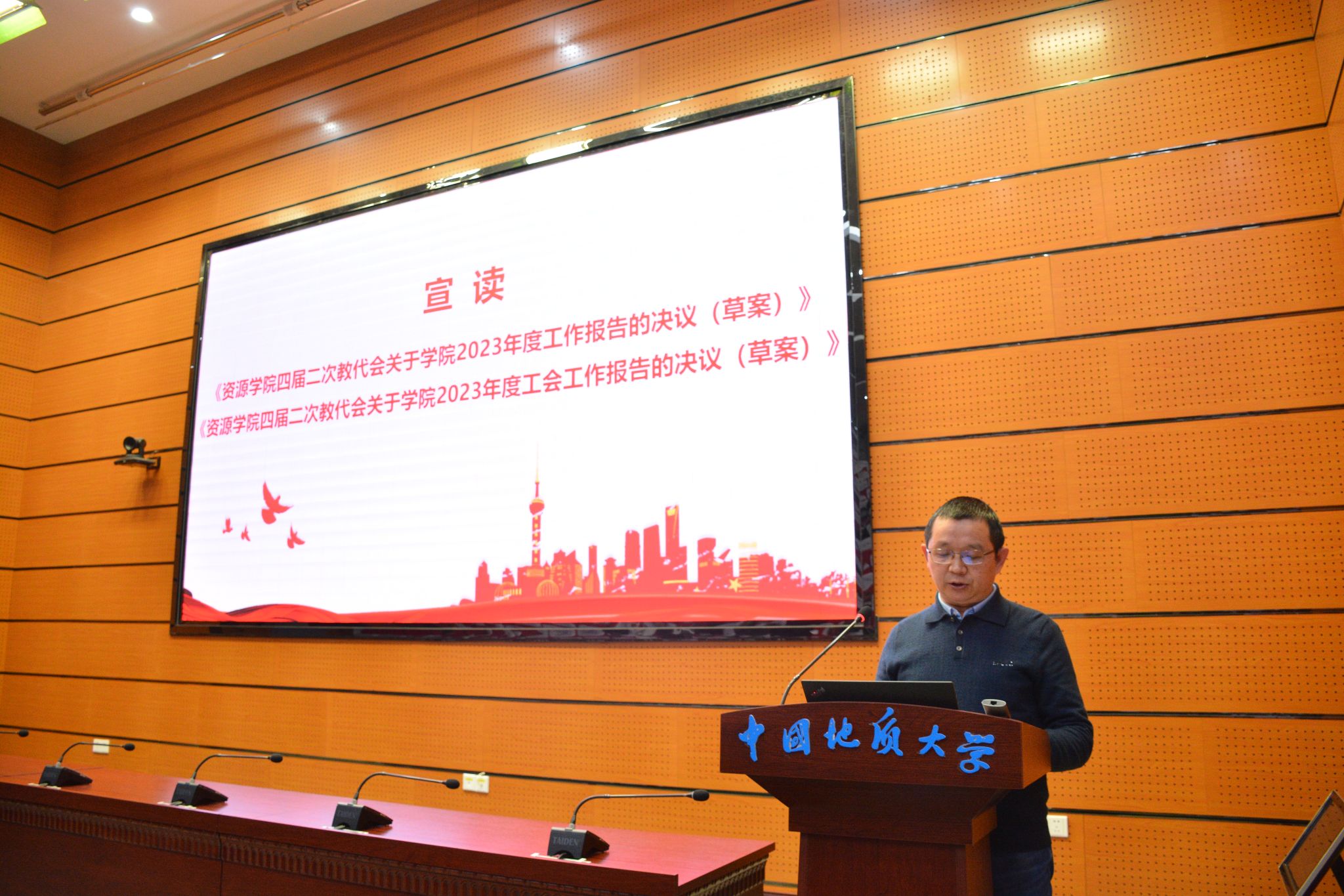 沈传波宣读《十大买球官方网站四届二次教代会关于学院2023年度工作报告的决议(草案)》《十大买球官方网站四届二次教代会关于学院2023年度工会工作报告的决议(草案)》,与会代表表决通过了两个决议。