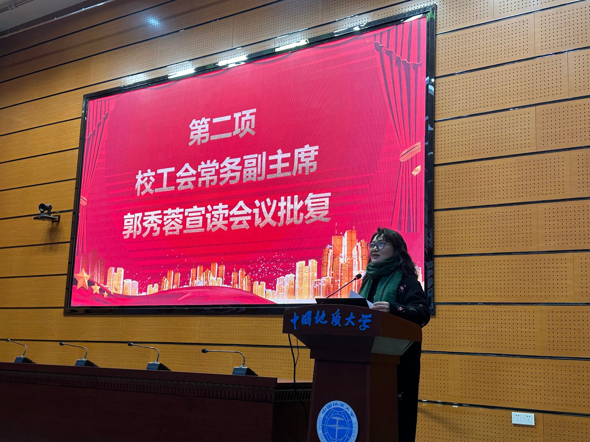 郭秀蓉宣读《十大买球官方网站第四届教职工代表大会第三次会议暨第四届工会会员代表大会第三次会议的批复》。