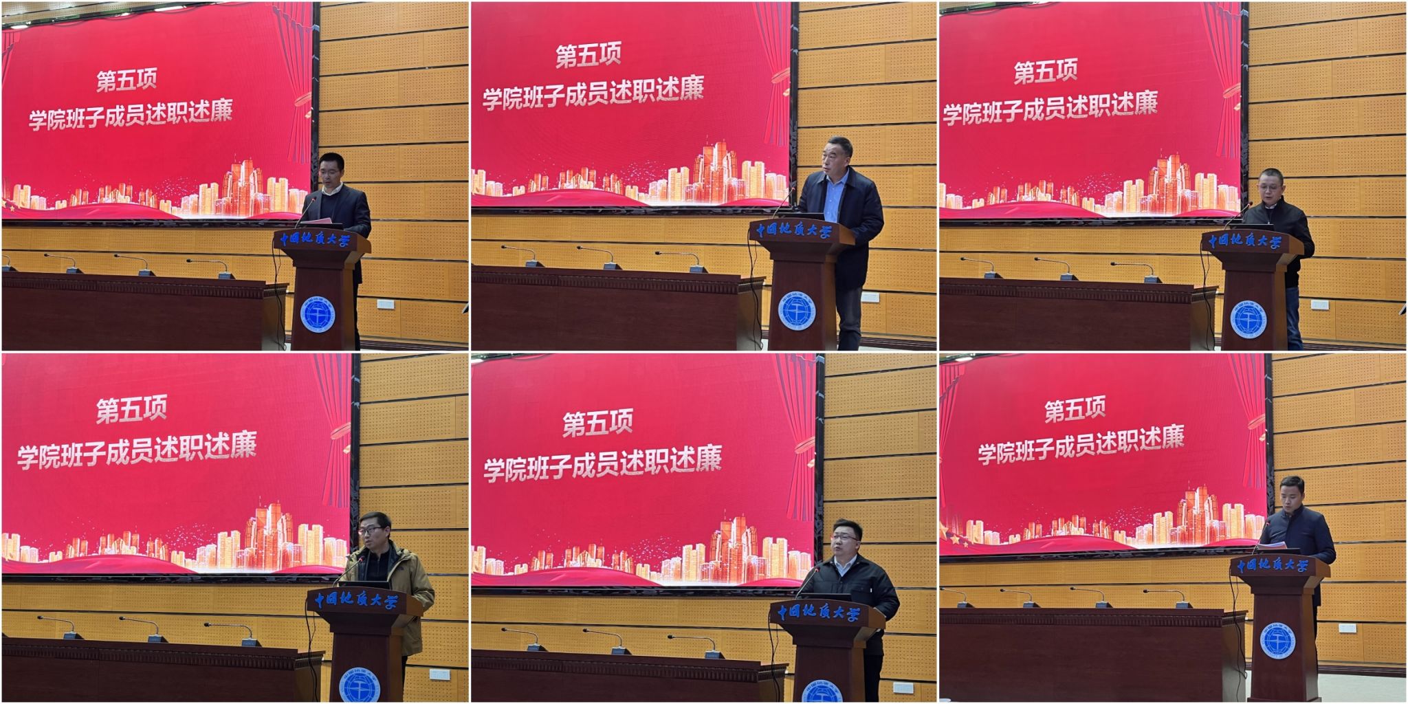 学院班子成员严德天、朱红涛、沈传波、谭文伦、钟志、李占轲依次述职述廉。