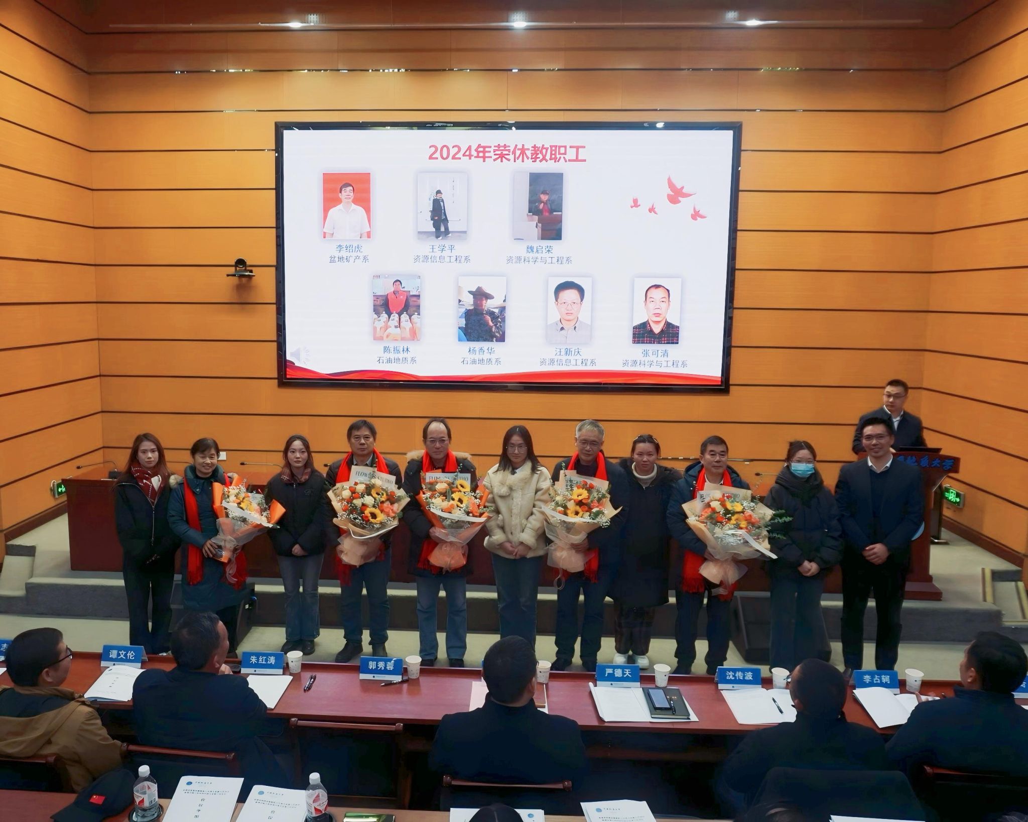 会上,严德天为2024年荣休教师李绍虎、王学平、魏启荣、陈振林、杨香华佩戴红围巾。