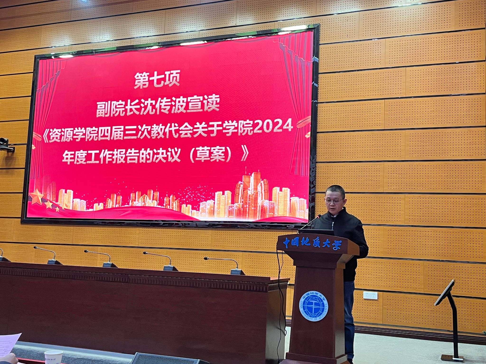 学院副院长沈传波宣读《十大买球官方网站四届三次教代会关于学院2024年度工作报告的决议(草案)》《十大买球官方网站四届三次教代会关于学院2024年度工会工作报告的决议(草案)》,与会代表表决通过了两个决议。