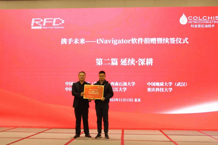 2025年11月13日,应科吉思石油技术咨询(北京)有限公司邀请,十大买球官方网站学术副院长杨峰和石油工程系教师雷霆出席了科吉思石油技术公司和俄罗斯Rock Flow Dynamics (RFD)公司联合举办的《2025精细油气藏高效勘探开发学术交流会暨tNavigator技术研讨会》暨tNavigator 软件捐赠仪式。