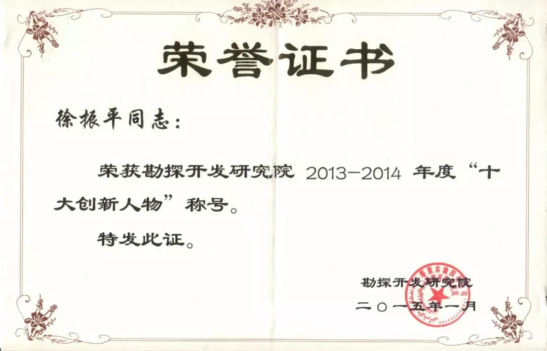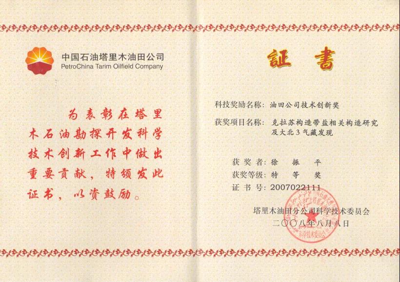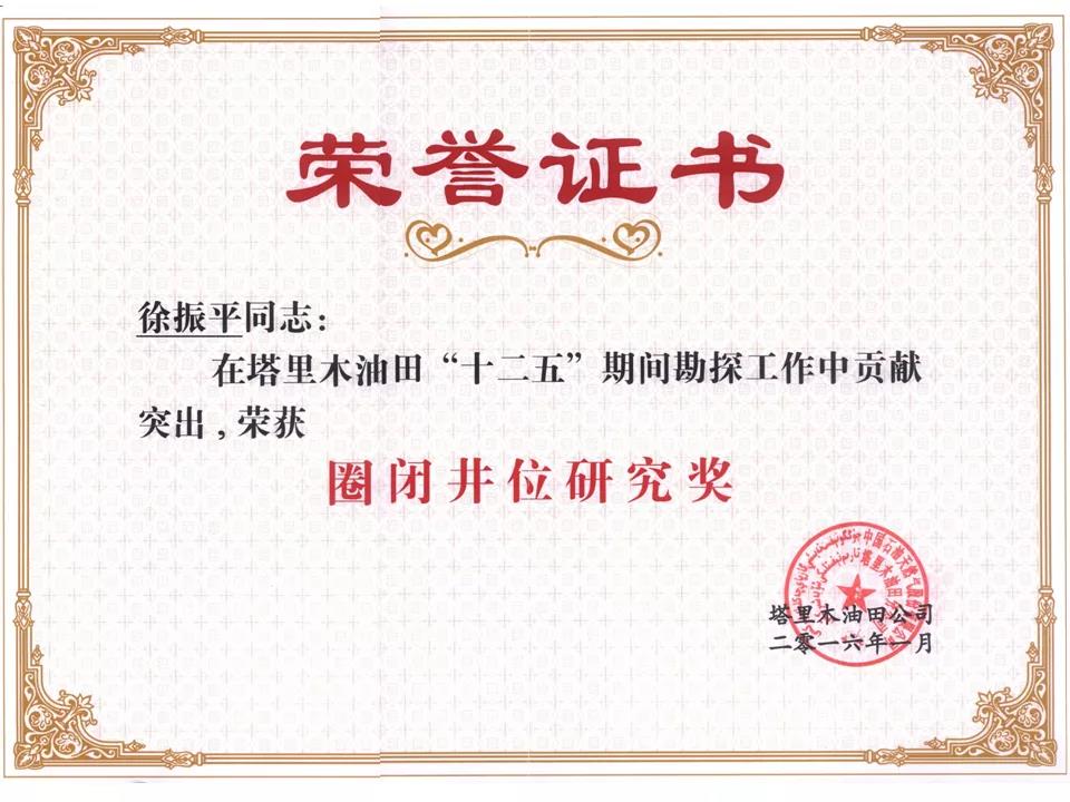 勇于创新,夺取了中秋1井战略突破,为塔里木油田找到一个5000亿方规模的战略接替区,正值库车天然气勘探高峰增长之时,徐振平没有迷恋于当时的勘探成果,主动向领导请缨到新区勘探的战场去,寻找新的油气勘探领域,2013年4月,他踏上了新区勘探之路。初到新区,一片荒凉,30000多平方千米的工区当时没有正钻井、没有预探目标,也没有勘探方向,徐振平带领新区勘探团队认真梳理了前人的研究成果细致分析石油地质条件,秋里塔格构造带久攻不克,在前人完成了大量的基础工作,他们这个团队还能做什么工作?还要做什么工作?通过多次的讨论论证,徐振平和他的团队大胆的提出,跳出现有构造带,重新开展一轮区域基础地质研究,他带领库车新区勘探团队一干又是两年多,功夫不负有心人,通过两年来的基础工作,完成了大量的基础地质图件,提出了库车南缘古隆起控圈、控储、控藏的地质认识,指导秋里塔格构造带先后部署了四口风险探井,2018年12月,中秋1井获得战略突破,发现了一个千亿立方米级的大型凝析气藏,为塔里木油田天然气勘探又发现了一个新的区带。中国石油集团公司授予中秋1战略突破特等奖,徐振平也因此荣获了中国石油集团第十届“优秀青年”称号,新疆自治区总工会授予的“建设3000万吨大油气田劳动竞赛功勋个人”荣誉。