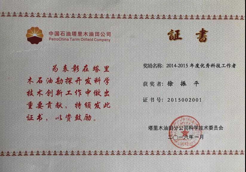 徐振平来到塔里木就一直从事库车前陆盆地的油气勘探工作,初来乍到,一不了解盆地的基础资料,二不熟悉勘探研究工作流程,常用的专业工作软件也不会用,他就从打扫办公室卫生、给老师傅、老专家端茶倒水开始,做起学徒,从画一张图到发现一个圈闭,部署一口井位,整整花了两年的时间打下扎实的基础,同时也熟悉了工区的基础资料,摸清了制约勘探研究的关键问题,两年后他担任库车项目大北区块课题长,期间,针对制约构造建模与圈闭落实的技术难题,引入和发展了盐相关构造建模技术,将以往的单一构造描述转变为构造变形系统研究,建立了基于前陆盆地挤压背景下的“盐上、盐层、盐下三位一体”的联动变形体系,厘定了大北-克深盐相关构造解释模型,提出了盐下发育大型逆冲叠瓦推覆体的初步认识,指导了当时的构造解释与圈闭落实;针对浅层砾岩无法识别、影响圈闭精细落实的技术难题,他带领课题组又提出了重磁电震融合砾岩识别与刻画技术,通过地震联合反演,明确砾岩岩相、岩性特征及速度变化规律,精细落实圈闭,该技术有效解决了浅层砾岩对圈闭落实精度的影响,先后准确落实圈闭20余个,得到了钻探的证实;针对库车山前复杂构造区盐下深层圈闭难以准确落实难题,徐振平带领课题组开展复杂构造区圈闭落实攻关研究,解决了高陡区断裂精细刻画与解释、地震资料偏移归位不准等问题,形成了山前复杂构造带相控速度建场与圈闭落实技术,成功应用于库车山前的油气勘探实践,先后发现了大北3、克深5、博孜1、阿瓦3等4个大型气藏。因其个人业绩突出,徐振平被塔里油田公司授予“十二五期间圈闭井位研究奖”、“先进科技工作者”等荣誉,以及多项科技奖励。